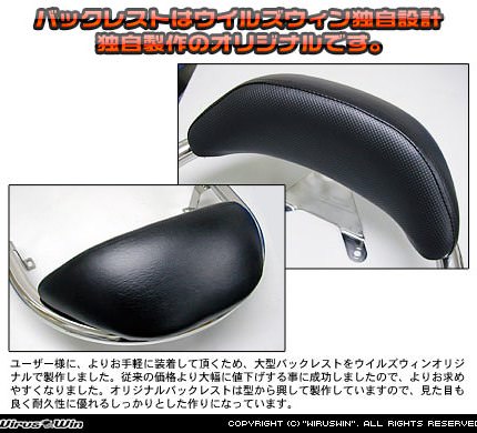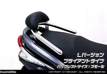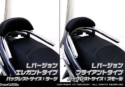 従来モデルのSバージョンからバーの長さを車両前方に延長し、新たに車体への固定部分を左右に追加して耐久性を上げ、剛性をアップいたしました。よりシッカリ感がアップしており、タンデム時に安心してご使用頂けるようになっております。●今、ローダウンはスクーターカスタムの定番となっておりますが、そのローフォルムに合わせて出来るだけ車体全体を低く見せるために、車体との一体感を追求したタンデムバーを開発いたしました!●車体に沿うように低くデザインされているのでボディラインにフィットし、かつ極太の32mm径のステンレスパイプを採用しましたので、存在感、目立ち度は抜群です!仕上げはバフ掛けを施していますので、高級感タップリでドレスアップには最適の逸品です!●バーが極太なので、パッセンジャーが握りやすく力を入れやすいので、安全性も高くなっております。お好みに応じてバーエンドの形状を、エレガントタイプとブライアントタイプの2種類から選択して頂けます。●また、ユーザー様に、よりお手軽に装着して頂くため、大型バックレストをウイルズウィンオリジナルで製作しました。従来の価格より大幅に値下げする事に成功しましたので、よりお求めやすくなりました。●オリジナルバックレストは型から興して製作していますので、見た目も良く耐久性に優れるしっかりとした作りになっています。●ラージサイズとスモールサイズの2サイズをご用意しておりますので、お好みに応じて選択して頂けます。(装着画像のバックレストはラージサイズです。)