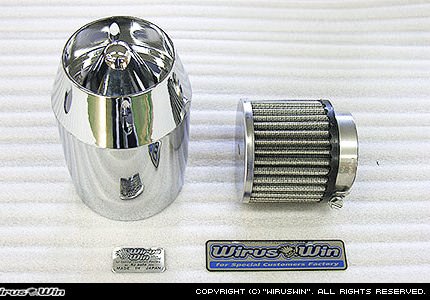 ■受注生産商品となっており、商品手配後 2週間程度入荷にお時間を頂きます。■吸気温度センサー差し込み口を装備しております。従来のエアークリーナーKitより、さらに低価格で手軽にパワーフィルター化できる今までに無いKitです。●ボディはプラスチック製でクロムメッキを施しております。インテーク部分はステンレス製バフ仕上げで、取付ステーには強度の強い12mm径のステンレス丸棒を採用し、幾度ものテストを重ね完成させていますので、強度、耐久性はバッチリです。●ノーマルエアークリーナーから、簡単にボルトオンで付け替えできます。ローダウン車両にも対応いたします。●クリーナーにはパワーフィルターが装備されています。従来はパワーフィルターにあわせて、インジェクションコントローラーなどでのセッティングを行わなくてはいけませんでしたが、この商品は必要吸気量にあわせて一定の範囲内で無段階に調整でき、還元パイプ対応ということもあり簡単にセッティング出しやすく、パワーアップが計れます。●ノーマルマフラー、ウイルズウィン製マフラーを付けた場合のエアーの量は、最小限から、15mm〜25mmのばした範囲で、ベストセッティングが捜し出せます。●ボアアップ、駆動系、抜けの良いマフラーに変更などの改造をされている場合は、インジェクションコントローラーなどでのセッティングが必要となることがあります。また、さらなるパワーアップを望む方にもインジェクションコントローラーなどでのセッティングは必要です。ノーマルマフラー、ウイルズウィン製マフラーでの組み合わせでは問題はありません。●カラーバリエーションとしてシルバーメッキタイプ、ブラックメッキタイプ、レッドメッキタイプ、ブルーメッキタイプの4種類をご用意しております。