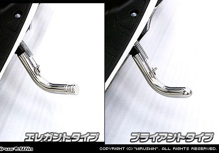 ローダウンはスクーターカスタムの定番となっておりますが、その際にノーマルスタンドですと掛けた際に車体の傾きが足らずに、不安定な状態になってしまいます。ローダウンして車高を下げる場合には、同時にスタンドもローダウンに対応するものに交換することをオススメします。●車体への取り付け部分は、粘りがあり破断しにくい「鉄」を採用し、バーの部分は錆に強い32mm径の極太、硬質ステンレスを採用しています。●ステンレス部分にはバフ仕上げが施してあり、高級感の高い仕上がりとなっております。【0〜20mmのローダウン車両に使用可能】●お好みに応じてバーエンドの形状を、エレガントタイプとブライアントタイプの2種類から選択して頂けます。●ローダウンカスタムをお考えの方、こだわってカスタムしたい方などに特にオススメです。WirusWinステッカー、WirusWinプレート付属。