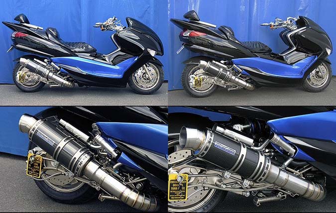 ■受注生産商品となっており、商品手配後 2週間程度入荷にお時間を頂きます。■マジェスティ250( 4D9 )用プレミアムマフラー ブラックカーボン仕様です。かち上げでも無くショートでも無い、革新的次世代マフラーです。迫力と高級感のトータルバランスに優れており、ノーマル車からハードカスタム車まで、若者から年配者まで幅広い層に対応するマフラーに仕上げました。サイレンサー出口には削り出しタイプを採用し、立体感ある造形が最終エンドを引き締めています。エキパイには極太76mm径パイプを輪切りカットし、溶接職人が丁寧に絶妙な技で繋ぎ合わせて造り上げており、ワンオフマフラーのような迫力とプレミアムな印象の高い仕様になっております。プレミアムマフラーは、高度な技術をぎっしりと余すところ無く詰め込んだ、プレミアムでクオリティの高い究極の一品に仕上がっています。ユーザー様のカスタムイメージやお好みに合わせて選択していただけます。サイレンサーメインパイプ以外には、耐久性、耐食性の高いステンレスを採用しております。幾度ものテストを重ね、高強度で耐久性に優れた製品に仕上げました。音量、音質にもとことん拘って、歯切れの良いサウンドを醸し出します。バッフル(消音用のパーツ)を標準装備しておりますので、簡単な作業で2種類の音量が選択できます。装着はステーを2点止めで固定し、サイレンサーをバンドで止めてエキパイをエンジン側に固定するだけですので比較的簡単に取り付けできます。性能面でも低中速の落ち込みをなくしスムーズな走行を実現させています。ローダウン車にも対応できるよう製作しています。極端なローダウン量、ショックの固さ、走行条件、ワイドカウル装着等で場合によりボディと干渉する恐れがありますのでご注意下さい。干渉してしまう際には走行時にはリアショックを一番固い設定にして使用してください。オプションとしてアルミ無垢材から削り出したビレットマフラーステーをご用意しております。WirusWinロゴも彫り込まれており、プレート、カラー、ボルトキャップすべてアルミ無垢材からの削り出しで製作し、シャープで超高級デザインに仕上がっています。更なるプレミアム感の演出に最適です。●バッフル装着時:排気音量約 92db●バッフル非装着時:排気音量 約 96db