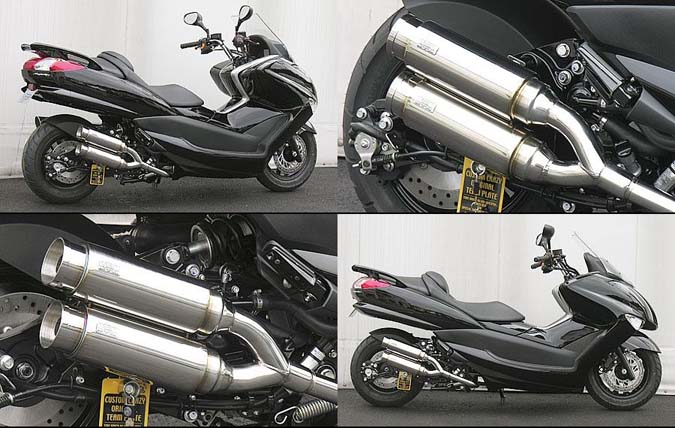 ■受注生産商品となっており、商品手配後 2週間程度入荷にお時間を頂きます。■マジェスティ250( 4D9 )用アトミックツインマフラー バズーカータイプです。2本出しタイプマフラーは発売以来大好評で、いまだ人気が衰えず絶好調です。アトミックツインマフラーは、ビックスクーター界で主流になりはじめたサイレンサーを短くした、最先端のドレンドマフラーです。極端に派手すぎずできるだけシンプルに自然なラインをイメージして制作しました。サイレンサーをできるだけ短くとり、車体のラインに調和させました。たくさんのお客様からの意見を取り入れて、あらゆるカスタムに似合うよう高級感が高く、かつシンプルなイメージでデザイン、製作いたしました。他社には無い時代を先行く2本出しマフラーが完成しました。バッフル(消音用パーツ)は、サイレンサー1本に対し1つずつ装備されていますので、簡単な作業で3種類の音量を選択できます。音質はとてもマイルドで重低音です。車体への固定方法は、画像では分かりにくいですがノーマルマフラーと同じ2点止めです。排気濃度センサーの取り付けも対応していますのでノーマルマフラーと同じように固定できます。ローダウン車にも対応できるよう製作しています。ローダウン車でのテスト走行では問題ありませんでしたが、ショックの固さ、走行条件等で場合によりボディと干渉する恐れがあります。走行時にはリアショックを一番固い設定にして使用してください。●バッフル両方装着時:排気音量 約 90db●バッフル片側装着時:排気音量 約 93db●バッフル非装着時 排気音量 約 96db