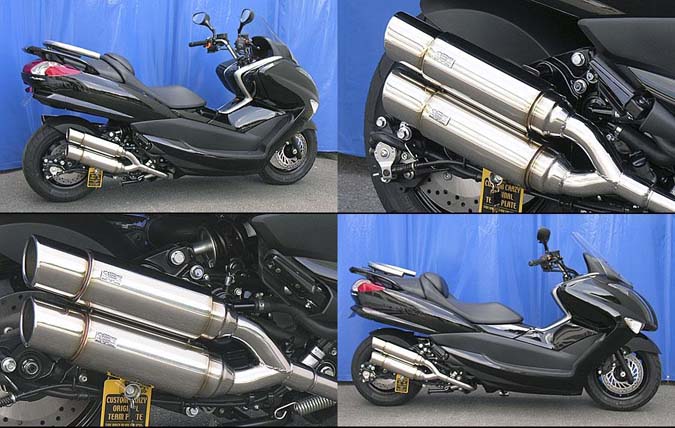 ■受注生産商品となっており、商品手配後 2週間程度入荷にお時間を頂きます。■マジェスティ250( 4D9 )用アトミックツインマフラー ポッパータイプです。2本出しタイプマフラーは発売以来大好評で、いまだ人気が衰えず絶好調です。アトミックツインマフラーは、ビックスクーター界で主流になりはじめたサイレンサーを短くした、最先端のドレンドマフラーです。極端に派手すぎずできるだけシンプルに自然なラインをイメージして制作しました。サイレンサーをできるだけ短くとり、車体のラインに調和させました。たくさんのお客様からの意見を取り入れて、あらゆるカスタムに似合うよう高級感が高く、かつシンプルなイメージでデザイン、製作いたしました。他社には無い時代を先行く2本出しマフラーが完成しました。バッフル(消音用パーツ)は、サイレンサー1本に対し1つずつ装備されていますので、簡単な作業で3種類の音量を選択できます。音質はとてもマイルドで重低音です。車体への固定方法は、画像では分かりにくいですがノーマルマフラーと同じ2点止めです。排気濃度センサーの取り付けも対応していますのでノーマルマフラーと同じように固定できます。ローダウン車にも対応できるよう製作しています。ローダウン車でのテスト走行では問題ありませんでしたが、ショックの固さ、走行条件等で場合によりボディと干渉する恐れがあります。走行時にはリアショックを一番固い設定にして使用してください。材質は、耐久性、耐腐食性の高いオールステンレス製です。 ●バッフル両方装着時:排気音量 約 90db●バッフル片側装着時:排気音量 約 93db●バッフル非装着時 排気音量 約 96db
