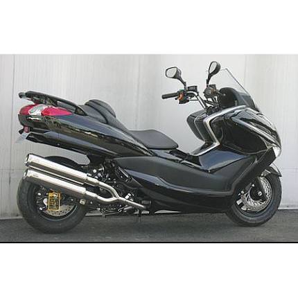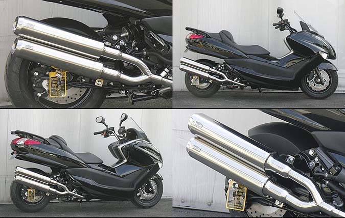 ■受注生産商品となっており、商品手配後 2週間程度入荷にお時間を頂きます。■マジェスティ250( 4D9 )用スタイリッシュツインマフラー ジェットです。2本出しタイプマフラーは発売以来大好評で、いまだ人気が衰えず絶好調です。このマフラーの特徴は、サイレンサーをできるだけ長くとり、車体のラインに調和させました。全体的なボリュームがアップしていますので、存在感は圧巻です。たくさんのお客様からの意見を取り入れて、あらゆるカスタムに似合うよう高級感が高く、かつシンプルなイメージでデザイン、製作いたしました。他社には無い時代を先行く2本出しマフラーが完成しました。バッフル(消音用パーツ)は、サイレンサー1本に対し1つずつ装備されていますので、簡単な作業で3種類の音量を選択できます。音質はとてもマイルドで重低音です。車体への固定方法は、画像では分かりにくいですがノーマルマフラーと同じ2点止めです。排気濃度センサーの取り付けも対応していますのでノーマルマフラーと同じように固定できます。ローダウン車にも対応できるよう製作しています。ローダウン車でのテスト走行では問題ありませんでしたが、ショックの固さ、走行条件等で場合によりボディと干渉する恐れがあります。走行時にはリアショックを一番固い設定にして使用してください。●バッフル両方装着時:排気音量 約 90db●バッフル片側装着時:排気音量 約 93db●バッフル非装着時 排気音量 約 96db