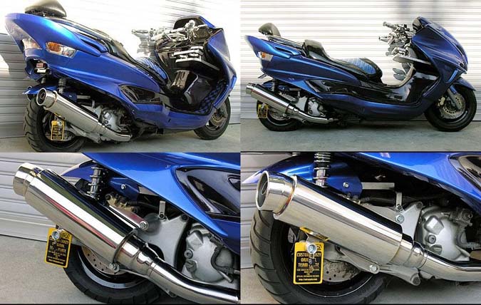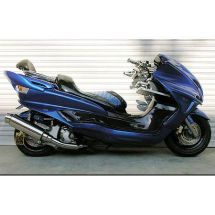 ■受注生産商品となっており、商品手配後 2週間程度入荷にお時間を頂きます。■マジェスティ250( 5GM・5SJ )用ステップマフラーです。新設計により更なる高品質、驚愕の低価格を実現しました!!マフラー選びでお悩みの方、まずはこのマフラーからいかがでしょうかデザインは幅広い層に気に入って頂けるよう、車体のラインに調和するようにサイレンサーの位置を吟味し、あらゆるカスタムに似合うようにシンプルながら高級感溢れるマフラーに仕上げました。サイレンサー出口には、内側にカールしたカールエンドタイプを使用しています。サイレンサーは迫力のある大型の125mm径を採用しました。音量、音質にもとことん拘って、何本ものテスト品の中からベストな構造を導き出して完成させました。うるさすぎず静かすぎず、歯切れの良い重低音サウンドを醸し出します。バッフル(消音用のパーツ)を標準装備しておりますので、簡単な作業で2種類の音量が選択できます。性能面でも低中速の落ち込みをなくしスムーズな走行を実現させています。ローダウン車にも対応しておりますが、極端にローダウンしている車両(30mm以上ダウン、大きめのサイドカウル装着車)は、マフラーとボディが干渉する恐れがありますので、購入・装着にはご注意ください。材質は耐久性、耐食性の高いオールステンレス製です。 ●バッフル装着時:排気音量約 92db●バッフル非装着時:排気音量 約 96db
