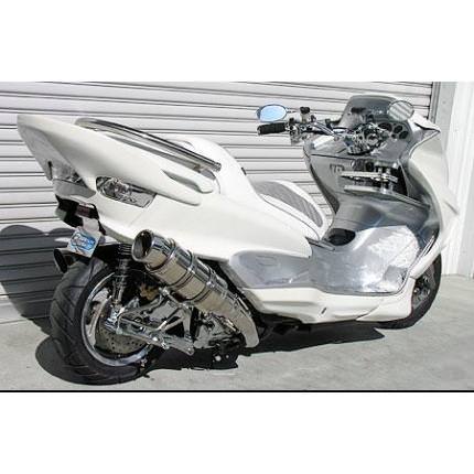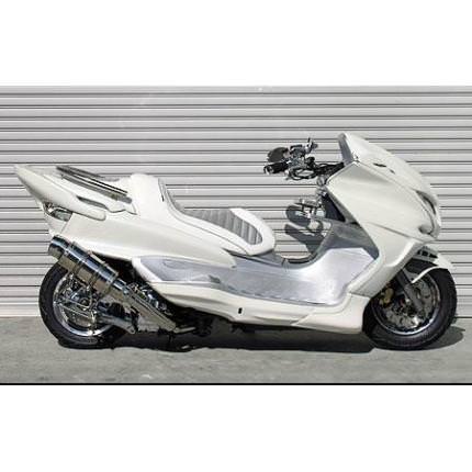 ■受注生産商品となっており、商品手配後 2週間程度入荷にお時間を頂きます。■マジェスティ250( 5GM・5SJ )用ビーストショートマフラー タイプSです。サイレンサー短くしたかち上げタイプのマフラーです。極端に派手すぎずできるだけシンプルに自然なラインをイメージして制作しました。ステーには強度の高い12mm径のステンレス丸棒を使用しており、幾度ものテストを重ねて、高強度で耐久性に優れた製品に仕上げました。サイレンサーにはレーシングマシンにも採用されている、超軽量で高硬度の チタン [titanium] を採用しています。サイレンサー以外の材質は、耐久性、耐食性の高いステンレス製になります。装着はステーを2点止めで固定し、サイレンサーをバンドで止めてエキパイをエンジン側に固定するだけですので比較的簡単に取り付けできます。音量、音質にもとことん拘って、歯切れの良いサウンドを醸し出します。バッフル(消音用のパーツ)を標準装備しておりますので、簡単な作業で2種類の音量が選択できます。出口は上品なインナーカールエンド100mm径のSタイプから選択。チタンサイレンサーボディは、焼き色バージョン、ポリッシュバージョンから、お好みに合わせて選択可能です。ローダウン車にも対応しておりますが、極端にローダウンしている車両(30mm以上ダウン、大きめのサイドカウル装着車)は、マフラーとボディが干渉する恐れがありますので、購入・装着にはご注意ください。※車体装着見本の画像は、ポリッシュバージョンです。●バッフル装着時:排気音量約 90db●バッフル非装着時:排気音量 約 94db