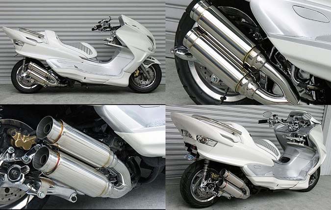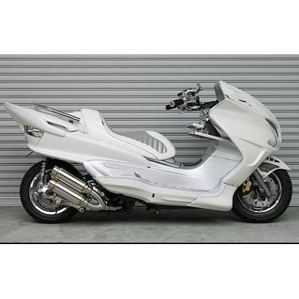 ■受注生産商品となっており、商品手配後 2週間程度入荷にお時間を頂きます。■マジェスティ250( 5GM・5SJ )用アトミックツインマフラー バズーカータイプです。2本出しタイプマフラーは発売以来大好評で、いまだ人気が衰えず絶好調です。アトミックツインマフラーは、ビックスクーター界で主流になりはじめたサイレンサーを短くした、最先端のドレンドマフラーです。極端に派手すぎずできるだけシンプルに自然なラインをイメージして制作しました。サイレンサーをできるだけ短くとり、車体のラインに調和させました。たくさんのお客様からの意見を取り入れて、あらゆるカスタムに似合うよう高級感が高く、かつシンプルなイメージでデザイン、製作いたしました。他社には無い時代を先行く2本出しマフラーが完成しました。バッフル(消音用パーツ)は、サイレンサー1本に対し1つずつ装備されていますので、簡単な作業で3種類の音量を選択できます。音質はとてもマイルドで重低音です。車体への固定方法は、画像では分かりにくいですがノーマルマフラーと同じ2点止めです。排気濃度センサーの取り付けも対応していますのでノーマルマフラーと同じように固定できます。また、ローダウン車にも対応できるよう製作しています。ローダウン車(ウイルズウィン製リアショック装着車)でのテスト走行では問題ありませんでしたが、極端なローダウン、ショックの固さ、走行条件等で場合によりボディと干渉する恐れがありますので、走行時にはリアショックを一番固い設定にし使用してください。材質は、耐久性、耐腐食性の高いオールステンレス製です。 ●バッフル両方装着時:排気音量 約 92db●バッフル片側装着時:排気音量 約 95db●バッフル非装着時 排気音量 約 98db