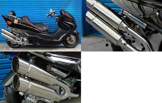 ■受注生産商品となっており、商品手配後 2週間程度入荷にお時間を頂きます。■マジェスティ250( 5GM・5SJ )用アトミックツインマフラー ポッパータイプです。2本出しタイプマフラーは発売以来大好評で、いまだ人気が衰えず絶好調です。アトミックツインマフラーは、ビックスクーター界で主流になりはじめたサイレンサーを短くした、最先端のドレンドマフラーです。極端に派手すぎずできるだけシンプルに自然なラインをイメージして制作しました。サイレンサーをできるだけ短くとり、車体のラインに調和させました。たくさんのお客様からの意見を取り入れて、あらゆるカスタムに似合うよう高級感が高く、かつシンプルなイメージでデザイン、製作いたしました。他社には無い時代を先行く2本出しマフラーが完成しました。バッフル(消音用パーツ)は、サイレンサー1本に対し1つずつ装備されていますので、簡単な作業で3種類の音量を選択できます。音質はとてもマイルドで重低音です。車体への固定方法は、画像では分かりにくいですがノーマルマフラーと同じ2点止めです。排気濃度センサーの取り付けも対応していますのでノーマルマフラーと同じように固定できます。また、ローダウン車にも対応できるよう製作しています。ローダウン車(ウイルズウィン製リアショック装着車)でのテスト走行では問題ありませんでしたが、極端なローダウン、ショックの固さ、走行条件等で場合によりボディと干渉する恐れがありますので、走行時にはリアショックを一番固い設定にし使用してください。材質は、耐久性、耐腐食性の高いオールステンレス製です。 ●バッフル両方装着時:排気音量 約 92db●バッフル片側装着時:排気音量 約 95db●バッフル非装着時 排気音量 約 98db