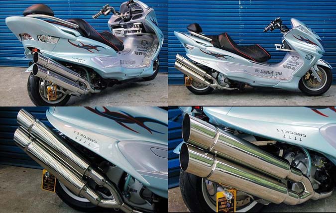 ■受注生産商品となっており、商品手配後 2週間程度入荷にお時間を頂きます。■マジェスティ250( 5GM・5SJ )用スタイリッシュツインマフラー バズーカータイプです。2本出しタイプマフラーは発売以来大好評で、いまだ人気が衰えず絶好調です。このマフラーの特徴は、サイレンサーをできるだけ長くとり、車体のラインに調和させました。全体的なボリュームがアップしていますので、存在感は圧巻です。たくさんのお客様からの意見を取り入れて、あらゆるカスタムに似合うよう高級感が高く、かつシンプルなイメージでデザイン、製作いたしました。他社には無い時代を先行く2本出しマフラーが完成しました。バッフル(消音用パーツ)は、サイレンサー1本に対し1つずつ装備されていますので、簡単な作業で3種類の音量を選択できます。音質はとてもマイルドで重低音です。車体への固定方法は、画像では分かりにくいですがノーマルマフラーと同じ2点止めです。排気濃度センサーの取り付けも対応していますのでノーマルマフラーと同じように固定できます。ローダウン車にも対応できるよう製作しています。ローダウン車でのテスト走行では問題ありませんでしたが、ショックの固さ、走行条件等で場合によりボディと干渉する恐れがあります。走行時にはリアショックを一番固い設定にして使用してください。材質は、耐久性、耐腐食性の高いオールステンレス製です。 ●バッフル両方装着時:排気音量 約 90db●バッフル片側装着時:排気音量 約 93db●バッフル非装着時 排気音量 約 96db