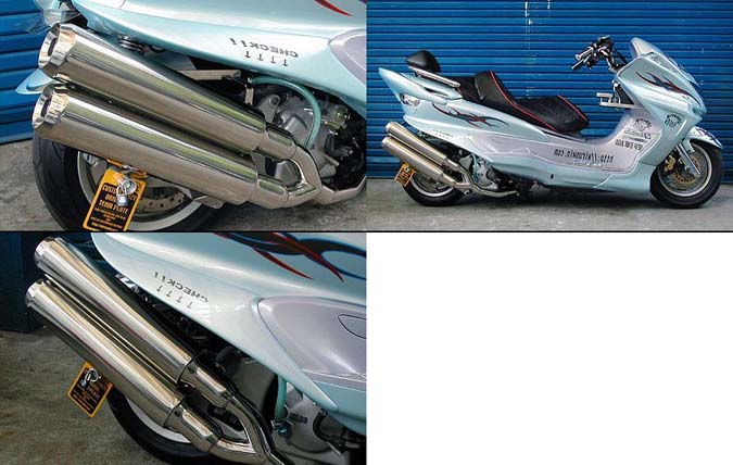 ■受注生産商品となっており、商品手配後 2週間程度入荷にお時間を頂きます。■マジェスティ250( 5GM・5SJ )用スタイリッシュツインマフラー バズーカータイプです。2本出しタイプマフラーは発売以来大好評で、いまだ人気が衰えず絶好調です。このマフラーの特徴は、サイレンサーをできるだけ長くとり、車体のラインに調和させました。全体的なボリュームがアップしていますので、存在感は圧巻です。たくさんのお客様からの意見を取り入れて、あらゆるカスタムに似合うよう高級感が高く、かつシンプルなイメージでデザイン、製作いたしました。他社には無い時代を先行く2本出しマフラーが完成しました。バッフル(消音用パーツ)は、サイレンサー1本に対し1つずつ装備されていますので、簡単な作業で3種類の音量を選択できます。音質はとてもマイルドで重低音です。車体への固定方法は、画像では分かりにくいですがノーマルマフラーと同じ2点止めです。排気濃度センサーの取り付けも対応していますのでノーマルマフラーと同じように固定できます。ローダウン車にも対応できるよう製作しています。ローダウン車でのテスト走行では問題ありませんでしたが、ショックの固さ、走行条件等で場合によりボディと干渉する恐れがあります。走行時にはリアショックを一番固い設定にして使用してください。材質は、耐久性、耐腐食性の高いオールステンレス製です。 ●バッフル両方装着時:排気音量 約 90db●バッフル片側装着時:排気音量 約 93db●バッフル非装着時 排気音量 約 96db