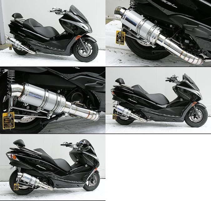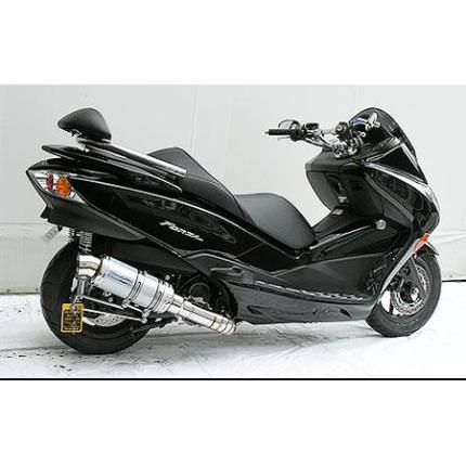 フォルツァ( MF10 )用プレミアムマフラー シルバーカーボン仕様です。かち上げでも無くショートでも無い、革新的次世代マフラーです。迫力と高級感のトータルバランスに優れており、ノーマル車からハードカスタム車まで、若者から年配者まで幅広い層に対応するマフラーに仕上げました。サイレンサー出口には削り出しタイプを採用し、立体感ある造形が最終エンドを引き締めています。エキパイには極太76mm径パイプを輪切りカットし、溶接職人が丁寧に絶妙な技で繋ぎ合わせて造り上げており、ワンオフマフラーのような迫力とプレミアムな印象の高い仕様になっております。プレミアムマフラーは、高度な技術をぎっしりと余すところ無く詰め込んだ、プレミアムでクオリティの高い究極の一品に仕上がっています。サイレンサーメインパイプ以外には、耐久性、耐食性の高いステンレスを採用しております。ステーには強度の高い12mm径のステンレス丸棒を採用しており、幾度ものテストを重ね、高強度で耐久性に優れた製品に仕上げました。音量、音質にもとことん拘って、歯切れの良いサウンドを醸し出します。バッフル(消音用のパーツ)を標準装備しておりますので、簡単な作業で2種類の音量が選択できます。装着はステーを2点止めで固定し、サイレンサーをバンドで止めてエキパイをエンジン側に固定するだけですので比較的簡単に取り付けできます。性能面でも低中速の落ち込みをなくしスムーズな走行を実現させています。ローダウン車にも対応できるよう製作しています。極端なローダウン量、ショックの固さ、走行条件、ワイドカウル装着等で場合によりボディと干渉する恐れがありますのでご注意下さい。干渉してしまう際には走行時にはリアショックを一番固い設定にして使用してください。●バッフル装着時:排気音量約 92db●バッフル非装着時:排気音量 約 96db