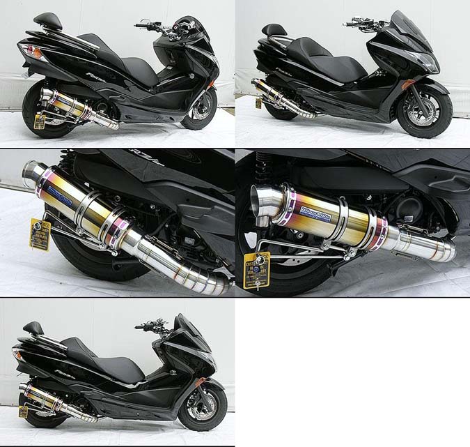 フォルツァ( MF10 )用プレミアムマフラー チタン仕様です。かち上げでも無くショートでも無い、革新的次世代マフラーです。迫力と高級感のトータルバランスに優れており、ノーマル車からハードカスタム車まで、若者から年配者まで幅広い層に対応するマフラーに仕上げました。サイレンサー出口には削り出しタイプを採用し、立体感ある造形が最終エンドを引き締めています。エキパイには極太76mm径パイプを輪切りカットし、溶接職人が丁寧に絶妙な技で繋ぎ合わせて造り上げており、ワンオフマフラーのような迫力とプレミアムな印象の高い仕様になっております。プレミアムマフラーは、高度な技術をぎっしりと余すところ無く詰め込んだ、プレミアムでクオリティの高い究極の一品に仕上がっています。サイレンサーメインパイプ以外には、耐久性、耐食性の高いステンレスを採用しております。ステーには強度の高い12mm径のステンレス丸棒を採用しており、幾度ものテストを重ね、高強度で耐久性に優れた製品に仕上げました。音量、音質にもとことん拘って、歯切れの良いサウンドを醸し出します。バッフル(消音用のパーツ)を標準装備しておりますので、簡単な作業で2種類の音量が選択できます。装着はステーを2点止めで固定し、サイレンサーをバンドで止めてエキパイをエンジン側に固定するだけですので比較的簡単に取り付けできます。性能面でも低中速の落ち込みをなくしスムーズな走行を実現させています。ローダウン車にも対応できるよう製作しています。極端なローダウン量、ショックの固さ、走行条件、ワイドカウル装着等で場合によりボディと干渉する恐れがありますのでご注意下さい。干渉してしまう際には走行時にはリアショックを一番固い設定にして使用してください。●バッフル装着時:排気音量約 92db●バッフル非装着時:排気音量 約 96db