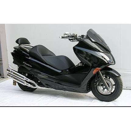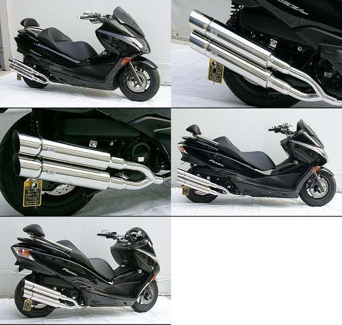 ■受注生産商品となっており、商品手配後 2週間程度入荷にお時間を頂きます。■フォルツァ( MF10 )用スタイリッシュツインマフラー ポッパータイプです。サイドバイサイドマフラーの2本出しタイプは発売以来大好評で、いまだ人気が衰えず絶好調です。しかしウイルズウィンは進化を留めることなく、さらに2本出しマフラーに勢いをつけるために第2弾を制作しました。このマフラーの特徴は、サイレンサーをできるだけ長くとり、車体のラインに調和させました。全体的なボリュームがアップしていますので、存在感は圧巻です。サイドバイサイドマフラーと同じくたくさんのお客様からの意見を取り入れて、あらゆるカスタムに似合うよう高級感が高く、かつシンプルなイメージでデザイン、製作いたしました。他社には無い時代を先行く2本出しマフラーが完成しました。バッフル(消音用パーツ)は、サイレンサー1本に対し1つずつ装備されていますので、簡単な作業で3種類の音量を選択できます。音質はとてもマイルドで重低音です。車体への固定方法は、画像では分かりにくいですがノーマルマフラーと同じ2点止めです。材質は、耐久性、耐腐食性の高いオールステンレス製です。 ●バッフル両方装着時:排気音量 約 90db●バッフル片側装着時:排気音量 約 93db●バッフル非装着時 排気音量 約 96db