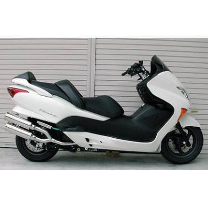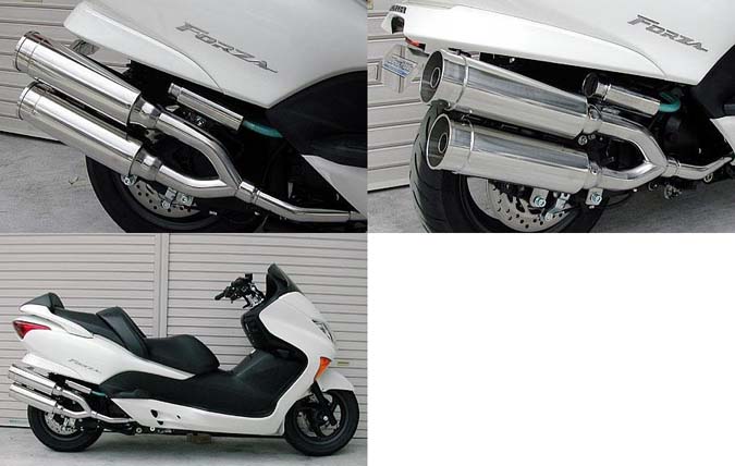 ■受注生産商品となっており、商品手配後 2週間程度入荷にお時間を頂きます。■フォルツァ( MF08 )用サイドバイサイドマフラー バズーカータイプです。あらゆるカスタムに似合うよう高級感が高くかつシンプルなイメージでデザインし、たくさんのお客様からの意見を取り入れて製作いたしました。バッフル(消音用パーツ)は、サイレンサー1本に対し1つずつ装備されていますので、簡単な作業で3種類の音量を選択できます。音質はとても重低音です。車体への固定方法は、画像では分かりにくいですがノーマルマフラーと同じ2点止めです。材質は、耐久性、耐腐食性の高いオールステンレス製です。 ●バッフル両方装着時:排気音量 約 92db●バッフル片側装着時:排気音量 約 95db●バッフル非装着時 排気音量 約 98db