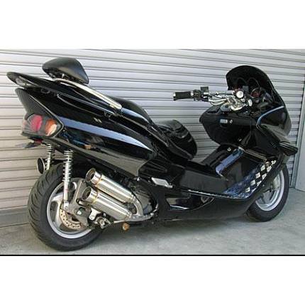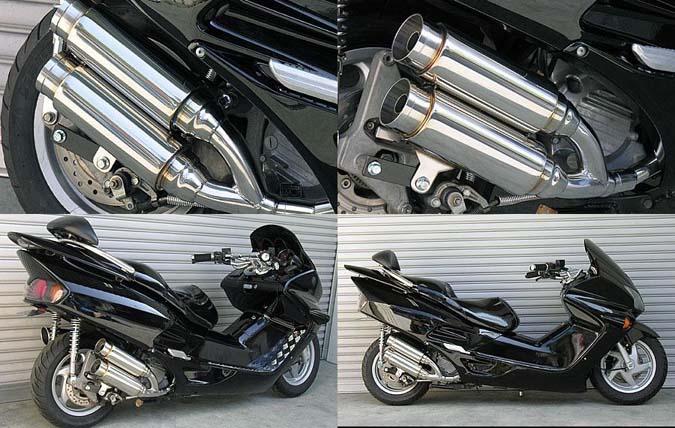 ■受注生産商品となっており、商品手配後 2週間程度入荷にお時間を頂きます。■フォルツァ(MF06)用アトミックツインマフラー バズーカータイプです。サイドバイサイドマフラー、スタイリッシュツインマフラーの2本出しタイプは発売以来大好評で、いまだ人気が衰えず絶好調です。しかしウイルズウィンは進化を留めることなく、さらに2本出しマフラーに勢いをつけるために第3弾を制作しました。アトミックツインマフラーは、ビックスクーター界で主流になりはじめたサイレンサーを短くした、最先端のドレンドマフラーです。極端に派手すぎずできるだけシンプルに自然なラインをイメージして制作しました。サイレンサーをできるだけ短くとり、車体のラインに調和させました。あらゆるカスタムに似合うよう高級感、シンプル感を出し、たくさんの方々からの意見を取り入れ製作しました。他社には無い時代を先行く2本出しマフラーが完成しました。バッフル(消音用パーツ)は、サイレンサー1本に対し1つずつ装備されていますので、簡単な作業で3種類の音量を選択できます。音質はとてもマイルドで重低音です。また、ローダウン車にも対応できるよう製作しています。ローダウン車(ウイルズウィン製リアショック装着車)でのテスト走行では問題ありませんでしたが、極端なローダウン、ショックの固さ、走行条件等で場合によりボディと干渉する恐れがありますので、走行時にはリアショックを一番固い設定にし使用してください。材質は、耐久性、耐腐食性の高いオールステンレス製です。 ●バッフル両方装着時:排気音量 約 92db●バッフル片側装着時:排気音量 約 95db●バッフル非装着時 排気音量 約 98db