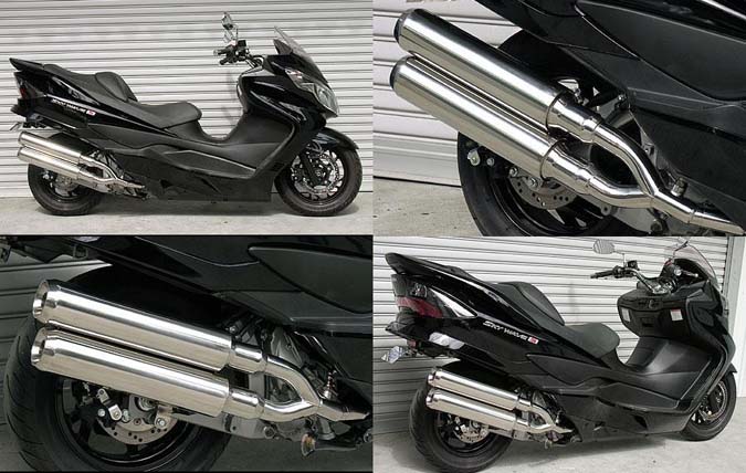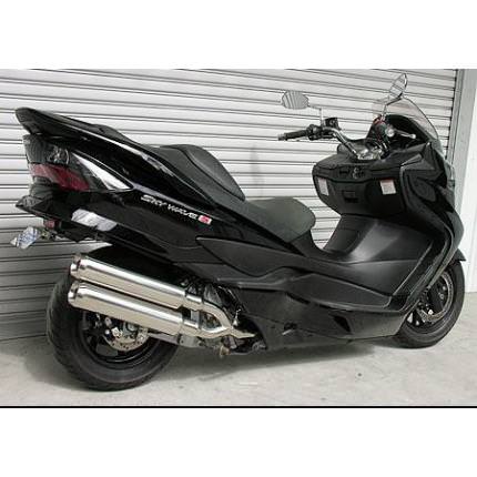 ■受注生産商品となっており、商品手配後 2週間程度入荷にお時間を頂きます。■スカイウェイブ( CJ44・45・46 )用スタイリッシュツインマフラー ジェットタイプです。サイドバイサイドマフラーの2本出しタイプは発売以来大好評で、いまだ人気が衰えず絶好調です。しかしウイルズウィンは進化を留めることなく、さらに2本出しマフラーに勢いをつけるために第2弾を制作しました。このマフラーの特徴は、サイレンサーをできるだけ長くとり、車体のラインに調和させました。全体的なボリュームがアップしていますので、存在感は圧巻です。サイドバイサイドマフラーと同じくたくさんのお客様からの意見を取り入れて、あらゆるカスタムに似合うよう高級感が高く、かつシンプルなイメージでデザイン、製作いたしました。他社には無い時代を先行く2本出しマフラーが完成しました。バッフル(消音用パーツ)は、サイレンサー1本に対し1つずつ装備されていますので、簡単な作業で3種類の音量を選択できます。音質はとてもマイルドで重低音です。車体への固定方法は、画像では分かりにくいですがノーマルマフラーと同じ2点止めです。※リアローダウン30mm以上の車体では、マフラーとボディが干渉する恐れがありますのでお勧めできません。購入・装着にはご注意ください。材質は、耐久性、耐腐食性の高いオールステンレス製です。 ●バッフル両方装着時:排気音量 約 90db●バッフル片側装着時:排気音量 約 93db●バッフル非装着時 排気音量 約 96db
