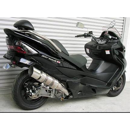 ■受注生産商品となっており、商品手配後 2週間程度入荷にお時間を頂きます。■スカイウェイブ( CJ44・45・46 )用ビーストショートマフラー タイプEです。今、流行のサイレンサーをカチ上げたタイプのマフラーです。極端に派手すぎず、できるだけシンプルにトータルバランスを考えて自然なラインをイメージして制作しました。ステーには強度の高い12mm径のステンレス丸棒を使用しており、幾度ものテストを重ねて、高強度で耐久性に優れた製品に仕上げました。サイレンサーにはレーシングマシンにも採用されている、超軽量で高硬度のチタン [titanium]を採用しています。サイレンサー以外の材質は、耐久性、耐食性の高いステンレス製になります。装着はステーを2点止めで固定し、サイレンサーをバンドで止めてエキパイをエンジン側に固定するだけですので比較的簡単に取り付けできます。音量、音質にもとことん拘って、歯切れの良いサウンドを醸し出します。バッフル(消音用のパーツ)を標準装備しておりますので、簡単な作業で2種類の音量が選択できます。出口はインパクトのある大口径115mm径のEタイプ、チタンサイレンサーボディは、焼き色バージョン、ポリッシュバージョンから、お好みに合わせて選択可能です。※車体装着見本の画像は、ポリッシュバージョンです。●バッフル装着時:排気音量約 90db●バッフル非装着時:排気音量 約 94db