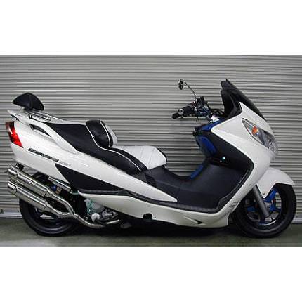 ■受注生産商品となっており、商品手配後 2週間程度入荷にお時間を頂きます。■スカイウェイブ(CJ43)用サイドバイサイドマフラー ポッパータイプです。あらゆるカスタムに似合うよう高級感が高くかつシンプルなイメージでデザインし、たくさんのお客様からの意見を取り入れて製作いたしました。サイレンサー出口はバズーカータイプとポッパータイプの2種類をご用意いたしました。お客様のお好みに合わせてお選び頂けます。バッフル(消音用パーツ)は、サイレンサー1本に対し1つずつ装備されていますので、簡単な作業で3種類の音量を選択できます。音質はとても重低音です。車体への固定方法は、画像では分かりにくいですがノーマルマフラーと同じ2点止めです。※リアローダウン30mm以上の車体では、マフラーとボディが干渉する恐れがありますのでお勧めできません。購入・装着にはご注意ください。材質は、耐久性、耐腐食性の高いオールステンレス製です。 ●バッフル両方装着時:排気音量 約 92db●バッフル片側装着時:排気音量 約 95db●バッフル非装着時 排気音量 約 98db