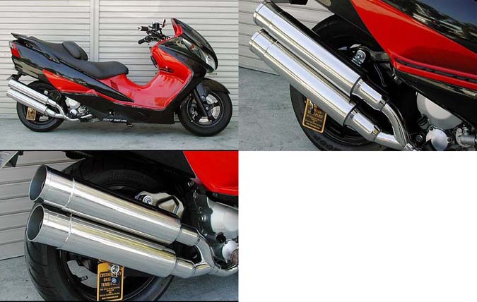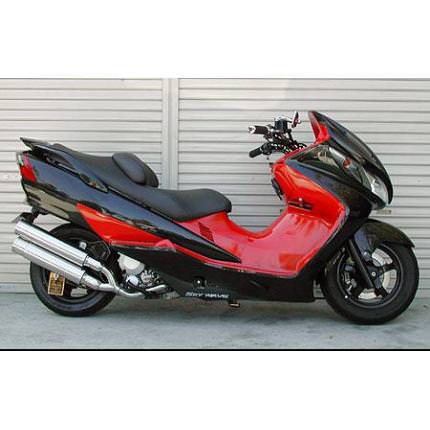 ■受注生産商品となっており、商品手配後 2週間程度入荷にお時間を頂きます。■スカイウェイブ(CJ43)用スタイリッシュツインマフラー バズーカータイプです。サイドバイサイドマフラーの2本出しタイプは発売以来大好評で、いまだ人気が衰えず絶好調です。しかしウイルズウィンは進化を留めることなく、さらに2本出しマフラーに勢いをつけるために第2弾を制作しました。このマフラーの特徴は、サイレンサーをできるだけ長くとり、車体のラインに調和させました。全体的なボリュームがアップしていますので、存在感は圧巻です。サイドバイサイドマフラーと同じくたくさんのお客様からの意見を取り入れて、あらゆるカスタムに似合うよう高級感が高く、かつシンプルなイメージでデザイン、製作いたしました。他社には無い時代を先行く2本出しマフラーが完成しました。サイレンサー出口はバズーカータイプとポッパータイプ、ジェットタイプの3種類をご用意いたしました。お客様のお好みに合わせてお選び頂けます。バッフル(消音用パーツ)は、サイレンサー1本に対し1つずつ装備されていますので、簡単な作業で3種類の音量を選択できます。音質はとてもマイルドで重低音です。車体への固定方法は、画像では分かりにくいですがノーマルマフラーと同じ2点止めです。※リアローダウン30mm以上の車体では、マフラーとボディが干渉する恐れがありますのでお勧めできません。購入・装着にはご注意ください。材質は、耐久性、耐腐食性の高いオールステンレス製です。 ●バッフル両方装着時:排気音量 約 90db●バッフル片側装着時:排気音量 約 93db●バッフル非装着時 排気音量 約 96db