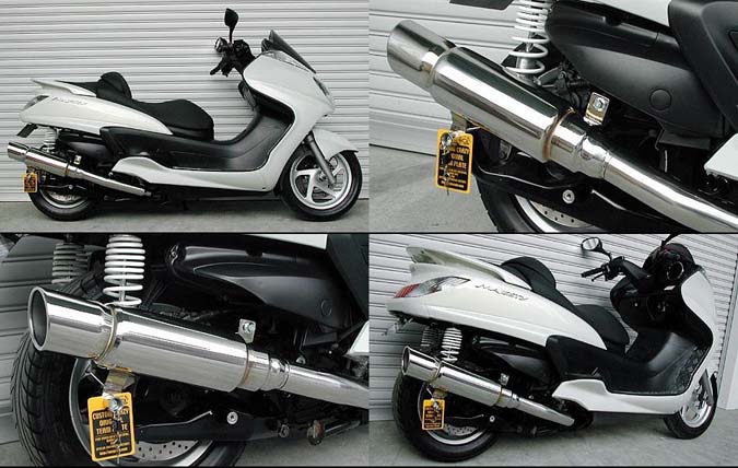 ■受注生産商品となっており、商品手配後 2週間程度入荷にお時間を頂きます。■グランドマジェスティ用ファーストマフラーです。新設計により更なる高品質、驚愕の低価格を実現しました!!マフラー選びでお悩みの方、まずはこのマフラーからいかがでしょうかデザインは幅広い層に気に入って頂けるよう、車体のラインに調和するようにサイレンサーの位置を吟味し、あらゆるカスタムに似合うようにシンプルながら高級感溢れるマフラーに仕上げました。サイレンサー出口には、内側にカールしたカールエンドタイプを使用しています。サイレンサーは大きすぎず小さすぎないバランスの良い115mm径を採用しました。音量、音質にもとことん拘って、何本ものテスト品の中からベストな構造を導き出して完成させました。うるさすぎず静かすぎず、歯切れの良い重低音サウンドを醸し出します。バッフル(消音用のパーツ)を標準装備しておりますので、簡単な作業で2種類の音量が選択できます。性能面でも低中速の落ち込みをなくしスムーズな走行を実現させています。ローダウン車にも対応しておりますが、極端にローダウンしている車両(30mm以上ダウン、大きめのサイドカウル装着車)は、マフラーとボディが干渉する恐れがありますので、購入・装着にはご注意ください。材質は耐久性、耐食性の高いオールステンレス製です。 ●バッフル装着時:排気音量約 92db●バッフル非装着時:排気音量 約 96db