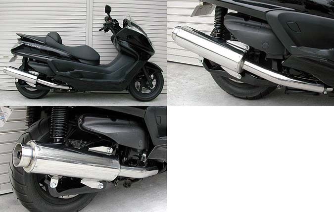 ■受注生産商品となっており、商品手配後 2週間程度入荷にお時間を頂きます。■グランドマジェスティ用ビッグバズーカーマフラーです。サイレンサーには大容量、大迫力の120mm径×400mmのステンパイプを採用。ボリュームがありますので存在感は圧巻です!サイレンサー出口とエキパイ接続部分には、ステンレスを削りだした部材を使用し、高級感抜群の仕上がりとなっております。エキパイ部分は2段階に太くなり、最終的にサイレンサーの迫力にマッチする60mm径のステンレスパイプで仕上げました。車体のラインに調和するようにサイレンサーの位置を吟味し、あらゆるカスタムに似合うようシンプルながら高級感をイメージし、たくさんの方々からの意見を取り入れ製作しました。音量、音質にもとことん拘って、何本ものテスト品の中からベストな構造を導き出して完成させました。うるさすぎず静かすぎず、歯切れの良い重低音サウンドを醸し出します。バッフル(消音用のパーツ)を標準装備しておりますので、簡単な作業で2種類の音量が選択できます。性能面でも低中速の落ち込みをなくしスムーズな走行を実現させています。ローダウン車にも対応しておりますが、極端にローダウンしている車両(30mm以上ダウン、大きめのサイドカウル装着車)は、マフラーとボディが干渉する恐れがありますので、購入・装着にはご注意ください。材質は、耐久性、耐腐食性の高いオールステンレス製です。 ●バッフル装着時:排気音量約 88db●バッフル非装着時:排気音量 約 92db