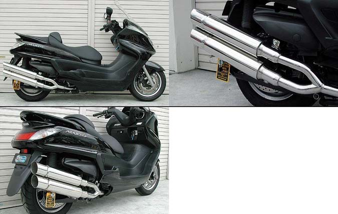■受注生産商品となっており、商品手配後 2週間程度入荷にお時間を頂きます。■グランドマジェスティ用スタイリッシュツインマフラー ポッパータイプです。2本出しタイプマフラーは発売以来大好評で、いまだ人気が衰えず絶好調です。このマフラーの特徴は、サイレンサーをできるだけ長くとり、車体のラインに調和させました。全体的なボリュームがアップしていますので、存在感は圧巻です。たくさんのお客様からの意見を取り入れて、あらゆるカスタムに似合うよう高級感が高く、かつシンプルなイメージでデザイン、製作いたしました。他社には無い時代を先行く2本出しマフラーが完成しました。バッフル(消音用パーツ)は、サイレンサー1本に対し1つずつ装備されていますので、簡単な作業で3種類の音量を選択できます。音質はとてもマイルドで重低音です。車体への固定方法は、画像では分かりにくいですがノーマルマフラーと同じ2点止めです。排気濃度センサーの取り付けも対応していますのでノーマルマフラーと同じように固定できます。ローダウン車にも対応できるよう製作しています。ローダウン車でのテスト走行では問題ありませんでしたが、ショックの固さ、走行条件等で場合によりボディと干渉する恐れがあります。走行時にはリアショックを一番固い設定にして使用してください。材質は、耐久性、耐腐食性の高いオールステンレス製です。 ●バッフル両方装着時:排気音量 約 90db●バッフル片側装着時:排気音量 約 93db●バッフル非装着時 排気音量 約 96db
