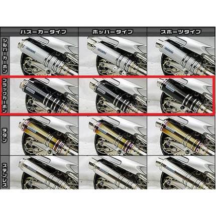 ■受注生産商品となっており、商品手配後 2週間程度入荷にお時間を頂きます。■グランドマジェスティ250用アルティメットマフラー ブラックカーボン仕様です。究極の理想型を具現化した新時代マフラーです。高級感を追求したデザインを施し、ノーマル車からハードカスタム車まで、若者から年配者まで幅広い層に対応するマフラーに仕上げました。アルティメットマフラーは、高度な技術をぎっしりと余すところ無く詰め込んだ、クオリティの高い究極の一品に仕上がっています。サイレンサー出口には削り出しタイプを採用し、立体感ある造形が最終エンドを引き締める【 バズーカータイプ 】、内巻きタイプのスラッシュカットが高級感を漂わせる【 ポッパータイプ 】、シンプルでスポーティでありながら高級感を損なわないエンド処理を施した【 スポーツタイプ 】の3種類をご用意しております。性能の違いはなくデザインの違いだけですので、お好みに合わせて選択して頂けます。ステーにはこれまでに無かったアルミ無垢材から削り出した、ビレットタイプ を採用しました。WirusWinロゴも彫り込まれております。プレート、カラー、ボルトキャップすべてアルミ無垢材からの削り出しで製作しており、シャープで超高級デザインに仕上がっています。幾度ものテストを重ね、高強度で耐久性に優れた製品に仕上げました。サイレンサー内部には、従来オプション扱いだった【 キャタライザー(排ガス浄化触媒)】を標準装備しておりますので、ノーマル同様の環境性能を発揮致します。音量、音質にもとことん拘って、歯切れの良いサウンドを醸し出します。音量は静か目に設定していますので、近所迷惑になる事無く走行できます。バッフル(消音用のパーツ)を標準装備しておりますので、簡単な作業で2種類の音量が選択できます。装着はステーを2点止めで固定し、サイレンサーをバンドで止めてエキパイをエンジン側に固定するだけですので比較的簡単に取り付けできます。性能面でも低中速の落ち込みをなくしスムーズな走行を実現させています。ローダウン車にも対応できるよう製作しています。極端なローダウン量、ショックの固さ、走行条件、ワイドカウル装着等で場合によりボディと干渉する恐れがありますのでご注意下さい。干渉してしまう際には走行時にはリアショックを一番固い設定にして使用してください。●バッフル装着時:排気音量約 90db●バッフル非装着時:排気音量 約 93db