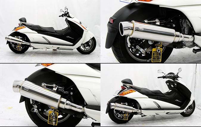 ■受注生産商品となっており、商品手配後 2週間程度入荷にお時間を頂きます。■ジェンマ用ステップマフラーです。新設計により更なる高品質、驚愕の低価格を実現しました!!マフラー選びでお悩みの方、まずはこのマフラーからいかがでしょうかデザインは幅広い層に気に入って頂けるよう、車体のラインに調和するようにサイレンサーの位置を吟味し、あらゆるカスタムに似合うようにシンプルながら高級感溢れるマフラーに仕上げました。サイレンサー出口には、内側にカールしたカールエンドタイプを使用しています。サイレンサーは迫力のある大型の125mm径を採用しました。音量、音質にもとことん拘って、何本ものテスト品の中からベストな構造を導き出して完成させました。うるさすぎず静かすぎず、歯切れの良い重低音サウンドを醸し出します。バッフル(消音用のパーツ)を標準装備しておりますので、簡単な作業で2種類の音量が選択できます。装着には丸棒ロングステーを採用し、サイレンサーをしっかり2点止めで固定できるようにしていますので耐久性も安心です。排気濃度センサーの取り付けも対応していますのでノーマルマフラーと同じように固定できます。性能面でも低中速の落ち込みをなくしスムーズな走行を実現させています。ローダウン車にも対応しております。材質は耐久性、耐食性の高いオールステンレス製です。 ●バッフル装着時:排気音量約 92db●バッフル非装着時:排気音量 約 96db