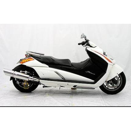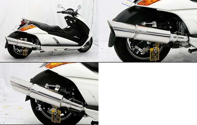 ■受注生産商品となっており、商品手配後 2週間程度入荷にお時間を頂きます。■ジェンマ用ビッグキャノンマフラーです。サイレンサー出口には、サイレンサーボディーに負けない程の大型なタイプを使用しています。サイレンサーボディーと出口との長さの比率を従来のマフラーより変える事で、大変太く迫力あるマフラーに見せることができました。エキパイ部分は3段階に太くなり、最終的にサイレンサーの迫力にマッチするよう高級感抜群の仕上がりとなっております。車体のラインに調和するようにサイレンサーの位置を吟味し、あらゆるカスタムに似合うようシンプルながら高級感をイメージし、たくさんの方々からの意見を取り入れ製作しました。音量、音質にもとことん拘って、何本ものテスト品の中からベストな構造を導き出して完成させました。うるさすぎず静かすぎず、歯切れの良い重低音サウンドを醸し出します。バッフル(消音用のパーツ)を標準装備しておりますので、簡単な作業で2種類の音量が選択できます。装着には丸棒ロングステーを採用し、サイレンサーをしっかり2点止めで固定できるようにしていますので耐久性も安心です。排気濃度センサーの取り付けも対応していますのでノーマルマフラーと同じように固定できます。性能面でも低中速の落ち込みをなくしスムーズな走行を実現させています。ローダウン車にも対応しておりますが、極端にローダウンしている車両(30mm以上ダウン、大きめのサイドカウル装着車)は、マフラーとボディが干渉する恐れがありますので、購入・装着にはご注意ください。材質は、耐久性、耐腐食性の高いオールステンレス製です。 ●バッフル装着時:排気音量約 90db●バッフル非装着時:排気音量 約 94db