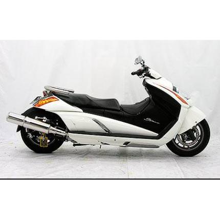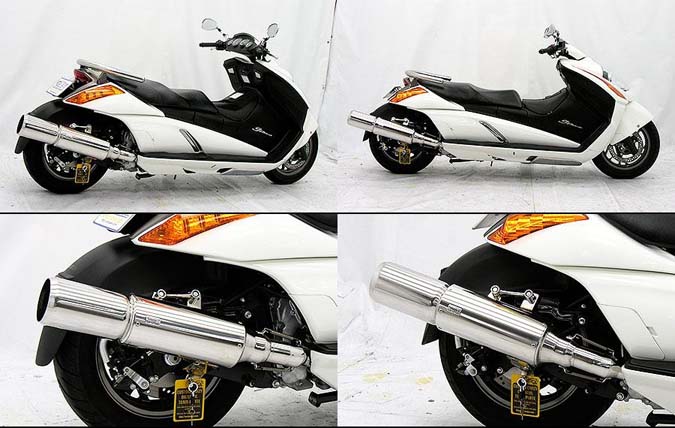 ジェンマ用ビッグボンバーマフラーです。サイレンサー出口には、サイレンサーボディーに負けない程の大型なタイプを使用しています。サイレンサーボディーと出口との長さの比率を従来のマフラーより変える事で、大変太く迫力あるマフラーに見せることができました。エキパイ部分は3段階に太くなり、最終的にサイレンサーの迫力にマッチするよう高級感抜群の仕上がりとなっております。車体のラインに調和するようにサイレンサーの位置を吟味し、あらゆるカスタムに似合うようシンプルながら高級感をイメージし、たくさんの方々からの意見を取り入れ製作しました。音量、音質にもとことん拘って、何本ものテスト品の中からベストな構造を導き出して完成させました。うるさすぎず静かすぎず、歯切れの良い重低音サウンドを醸し出します。バッフル(消音用のパーツ)を標準装備しておりますので、簡単な作業で2種類の音量が選択できます。装着には丸棒ロングステーを採用し、サイレンサーをしっかり2点止めで固定できるようにしていますので耐久性も安心です。排気濃度センサーの取り付けも対応していますのでノーマルマフラーと同じように固定できます。性能面でも低中速の落ち込みをなくしスムーズな走行を実現させています。ローダウン車にも対応しておりますが、極端にローダウンしている車両(30mm以上ダウン、大きめのサイドカウル装着車)は、マフラーとボディが干渉する恐れがありますので、購入・装着にはご注意ください。材質は、耐久性、耐腐食性の高いオールステンレス製です。 ●バッフル装着時:排気音量約 90db●バッフル非装着時:排気音量 約 94db