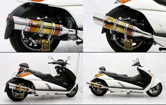 ■受注生産商品となっており、商品手配後 2週間程度入荷にお時間を頂きます。■ジェンマ用エクシードチタンマフラーです。サイレンサーメインパイプにレインボーカラーの焼き色を施したチタンパイプを採用しました。ステンレス製のバンド2本で車体に固定します。サイレンサー出口には、サイレンサーボディーに負けない程の大型なタイプを使用しています。サイレンサーの両端末には、エッチング加工のエンドバンドを使用し、細かい箇所でドレスアップ演出を施しています。また、エキパイとサイレンサーのエキパイのジョイント部には、スムーズなラインを出すためにテーパー加工設計にしています。幅広い層に気に入ってもらえるよう、シンプルで高級感溢れるマフラーに仕上げました。車体のラインに調和するようにサイレンサーの位置を吟味し、あらゆるカスタムに似合うようシンプルながら高級感をイメージし、たくさんの方々からの意見を取り入れ製作しました。これ以上にない完成度です。音量、音質にもとことん拘って、何本ものテスト品の中からベストな構造を導き出して完成させました。うるさすぎず静かすぎず、歯切れの良い重低音サウンドを醸し出します。バッフル(消音用のパーツ)を標準装備しておりますので、簡単な作業で2種類の音量が選択できます。装着には丸棒ロングステーを採用し、サイレンサーをしっかり2点止めで固定できるようにしていますので耐久性も安心です。排気濃度センサーの取り付けも対応していますのでノーマルマフラーと同じように固定できます。性能面でも低中速の落ち込みをなくしスムーズな走行を実現させています。ローダウン車にも対応しておりますが、極端にローダウンしている車両(30mm以上ダウン、大きめのサイドカウル装着車)は、マフラーとボディが干渉する恐れがありますので、購入・装着にはご注意ください。サイレンサーメインパイプ以外はオールステンレス製です。 ●バッフル装着時:排気音量約 90db●バッフル非装着時:排気音量 約 94db