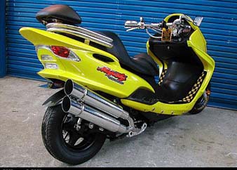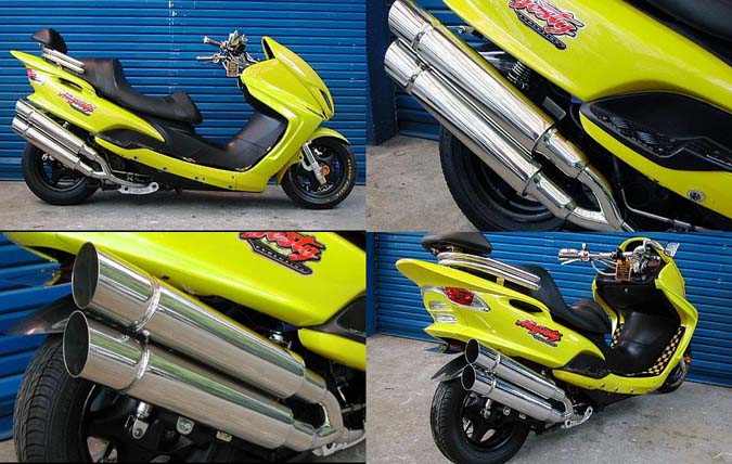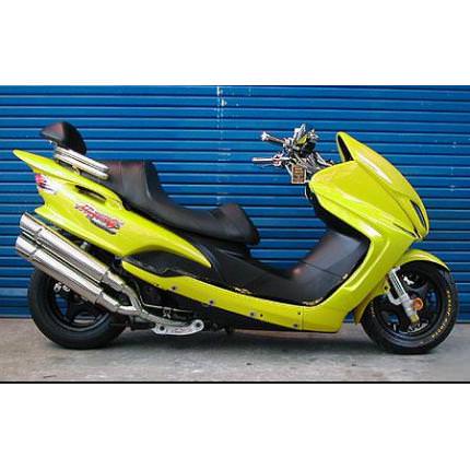 ■受注生産商品となっており、商品手配後 2週間程度入荷にお時間を頂きます。■マジェスティ125用スタイリッシュツインマフラー ポッパータイプです。2本出しタイプマフラーは発売以来大好評で、いまだ人気が衰えず絶好調です。このマフラーの特徴は、サイレンサーをできるだけ長くとり、車体のラインに調和させました。全体的なボリュームがアップしていますので、存在感は圧巻です。たくさんのお客様からの意見を取り入れて、あらゆるカスタムに似合うよう高級感が高く、かつシンプルなイメージでデザイン、製作いたしました。他社には無い時代を先行く2本出しマフラーが完成しました。バッフル(消音用パーツ)は、サイレンサー1本に対し1つずつ装備されていますので、簡単な作業で3種類の音量を選択できます。音質はとてもマイルドで重低音です。車体への固定方法は、画像では分かりにくいですがノーマルマフラーと同じ2点止めです。ローダウン車にも対応できるよう製作しています。ローダウン車でのテスト走行では問題ありませんでしたが、ショックの固さ、走行条件等で場合によりボディと干渉する恐れがあります。走行時にはリアショックを一番固い設定にして使用してください。材質は、耐久性、耐腐食性の高いオールステンレス製です。 ●バッフル両方装着時:排気音量 約 88db●バッフル片側装着時:排気音量 約 91db●バッフル非装着時 排気音量 約 94db
