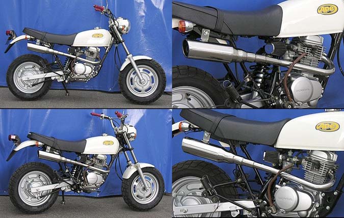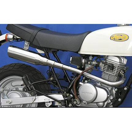 ●エイプ100用のテイストアップマフラーです。●ダウンタイプだったテイストマフラーのアップタイプバージョンです。●今までに無い、大型口径の出口をそのままサイレンサーにした斬新なマフラーです。●サイレンサー内部構造は消音材等のグラスウールは使用せず、隔壁構造で音を押さえているため、●音量変化の無いマフラーに仕上がっています。●性能面でも排圧によるコントロールで低速から高速までスムーズな走行を実現しています。●バッフル(消音用のパーツ)を標準装備しておりますので、簡単な作業で2種類の音量が選択できます。●音質は低音の効いた歯切れの良いサウンドを醸し出します。●取り付けは、ボルトオンで取り付けするだけですので簡単に装着できます。●キックペダルはそのままで取り付けでき使用も問題ありません。●オールステンレス製●バッフル装着時:排気音量約 89db●バッフル非装着時:排気音量 約 93db