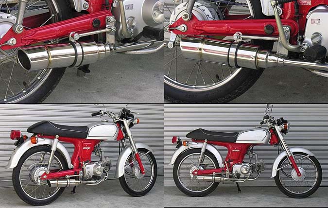 CD50用のロイヤルマフラー ポッパータイプです。落ち着きのあるハイクオリティーデザインでシンプルに仕上がっています。性能面では排圧によるコントロールで低速から高速までスムーズな走行を実現しています。消音材には、上質のグラスウールとスチールウールを使用していますので、音は、静音で重低音サウンドを醸し出します。心地よい低音を堪能できます。取り付けはサイレンサー根元とサイレンサーバンドを使用してしっかり2点止めで固定きます。ボルトオンで簡単に装着できます。センタースタンド、キックペダルはそのままで取り付けでき使用も可能です。バッフル(消音用のパーツ)を標準装備しておりますので、簡単な作業で2種類の音量が選択できます。このマフラーは、出口の違う3タイプを用意していますので、お好みでお選び下さい。オールステンレス製。●バッフル装着時:排気音量約 84db●バッフル非装着時:排気音量 約 88db