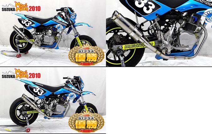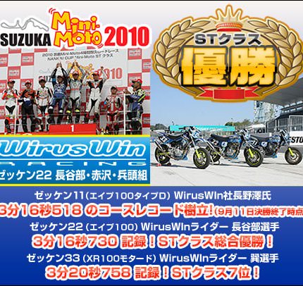 ■受注生産商品となっており、商品手配後 2週間程度入荷にお時間を頂きます。■XR100 モタード用 レーシングマフラーです。●レースシーンにおいて最高の性能を発揮することのみを追求した、完全レース用設計です。●※レース専用マフラーにつき、公道での使用は不可ですのでご注意下さい。●2010 鈴鹿 Mini-Moto 4時間耐久ロードレース NANKAI CUP Mini-Moto STクラスにおいて、圧倒的な速さで総合優勝を果たしコースレコードも樹立した脅威のマフラーと、全く同じ仕様の最強最速マフラーです!●鈴鹿サーキットフルコース(天候:晴れ/コース:ドライ)●ゼッケン11 エイプ100 タイプD+WirusWin社長 野澤氏(体重:49kg)●ラップタイム“3分16秒518”記録!コースレコード樹立!(9月11日決勝終了時点)●ゼッケン22 エイプ100+WirusWinライダー 長谷部選手(体重:55kg)●ラップタイム“3分16秒730”記録!STクラス総合優勝!●ゼッケン33 XR100モタード+WirusWinライダー 巽選手(体重:52kg)●ラップタイム“3分20秒758”記録!STクラス7位!●鈴鹿サーキットフルコースで強い登り勾配のS字コーナーからダンロップコーナーでも、グイグイと加速しながら登っていく豊富なトルクと、前車のスリップストリームに入った際に圧倒的な加速を魅せる伸びを両立させた、究極のレーシングマフラーです。●体重が63kgもあるライダーが乗っても、3分19秒台でのコンスタントな走行ができるほどです。●マフラーの開発は、ウイルズウィンが誇る専属ライダーが走行テスト、開発を行ない、そのインプレッションを元に何十本と仕様変更を重ねて完成させた、究極のレーシングマフラーです。●『マフラーだけでここまで変わるのか!』と言ってしまうほど速くなります。●レーシングマフラーは、サポートライダーが現状で最高と判断してレースで使用したそのままの仕様を市販化しています。レースで使用した先行開発タイプと市販タイプとの区別をする事無く、現状で最高と判断した仕様を即時フィードバックして製品としておりますので、バイクの仕上がりとライダーの腕次第で十分にトップ争いが可能です。●ミニモト4耐で総合優勝を果たしコースレコードも樹立した際の、鈴鹿サーキットフルコース走行時のセッティングマニュアルを同梱しております。●エキパイ、サイレンサー内部はステンレス製、サイレンサーボディは軽量高剛性なチタン製を採用しています。●装着はステーを固定し、サイレンサーをバンドで止めてエキパイをエンジン側に固定するだけですので簡単に取り付けできます。●音量は優勝再車検時に4000rpmで92db・Aと性能を犠牲にすることなく効果的に抑えられており、競技規則に定められている走行後の音量規制値(99db・A)をらくらくクリアします。●排気口先端の形状やサイズなど、規則書で細かく規定されている点も全てクリアしており、何の追加工も必要なく競技車検に合格することができます。●レーシングマフラーは更なる性能追求のための常時改良を続けていますので、予告無く仕様変更が施される場合がある事を予めご了承ください。