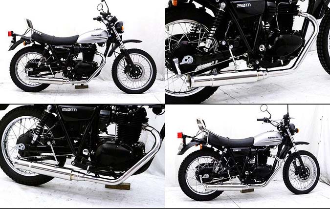 ■受注生産商品となっており、商品手配後 2週間程度入荷にお時間を頂きます。■250TR用 オープンエンドマフラーです。※型式:JBK-BJ250F・FI(フューエルインジェクション)仕様車に適合します。型式:BA-BJ250F・キャブレター仕様車には適合しませんのでご注意下さい。※マフラー全てを交換するフルエキゾーストタイプのマフラーです。※平成22年4月1日より施行された認証制度に適合する認証マフラーではありません。排気口を拡げたクラシカルなイメージのシルエットで、シンプルな形状でありながら存在感溢れるスタイルに仕上げました。チョッパースタイル、アメリカンスタイル、カフェレーサースタイルに合うマフラーです。エキパイは存在感を出すため太めの45mm径を採用。サイレンサーは細すぎず太すぎずの90mm径を採用しています。このマフラーの1番の売りは「音」です。音量、音質は抜群です!低くて重厚感のある重低音がドッドッドっと響く、抜群のサウンドです!決して音がうるさいとか、耳障りな音ではありませんので、安心して街乗りで使用できます。バッフル(消音用のパーツ)を標準装備しておりますので、簡単な作業で2種類の音量が選択できます。性能面では排圧コントロールによって低速から高速までスムーズな走行を実現しています。取り付けはノーマルと同じ様に無加工ボルトオンで簡単に装着できます。耐久性、耐腐食性の高いオールステンレス製。●排気音量:約88デシベル(バッフル装着時)、約92デシベル(バッフル取り外し時)。