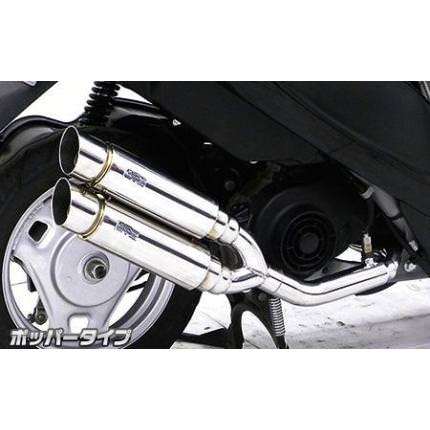 ■受注生産商品となっており、商品手配後 2週間程度入荷にお時間を頂きます。■2本出しタイプマフラーは発売以来大好評で、いまだ人気が衰えず絶好調です。アトミックツインマフラーは、ビックスクーター界で主流になりはじめたサイレンサーを短くした、最先端のドレンドマフラーです。極端に派手すぎずできるだけシンプルに自然なラインをイメージして制作しました。サイレンサーをできるだけ短くとり、車体のラインに調和させました。たくさんのお客様からの意見を取り入れて、あらゆるカスタムに似合うよう高級感が高く、かつシンプルなイメージでデザイン、製作いたしました。他社には無い時代を先行く2本出しマフラーが完成しました。バッフル(消音用パーツ)は、サイレンサー1本に対し1つずつ装備されていますので、簡単な作業で3種類の音量を選択できます。音質はとてもマイルドで重低音です。車体への固定方法は、画像では分かりにくいですがノーマルマフラーと同じ2点止めです。ローダウン車にも対応できるよう製作しています。ローダウン車でのテスト走行では問題ありませんでしたが、ショックの固さ、走行条件等で場合によりボディと干渉する恐れがあります。走行時にはリアショックを一番固い設定にして使用してください。 ※材質は、耐久性、耐腐食性の高いオールステンレス製です。 ※音量:バッフル両方装着時排気音量 約 84db・バッフル片側装着時排気音量 約 86db・バッフル非装着時排気音量 約 88db