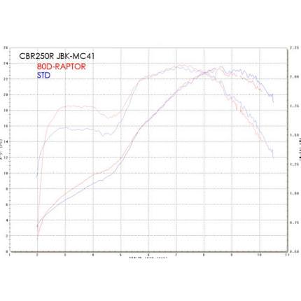 独自開発の多段圧縮膨張構造サイレンサー“RAPTOR”を搭載しました。 サイレンサー内部は、3つの膨張室に分かれており、その膨張室の容量や隔壁間を結ぶバイパスパイプ全長およびパイプ内径をミリ単位で変更しながら実走行テスト・シャーシダイナモテスト・モニタリングを行い、ベストな背圧セッティングを追及してから製品化しております。開発にかかるコストにとらわれずに研究を行った結果、1000種類以上のサイレンサー構想と300種類を超える試作サイレンサーを製作し、それらが80D-RAPTORブランドマフラー開発の基本となっております。スタンダードサイレンサーとの交換(スリップオン)のみで走行性能アップを実現しました。トルク特性をフルフラットに向上させているため、とても扱い易く、レスポンスが良く、どの回転域からスロットルをオープンにしても力強い加速フィールを発揮します。安心してライディングを楽しんでいただけるよう、平成22年4月1日以降生産車から適用になった「マフラー政府認証」を取得しております。