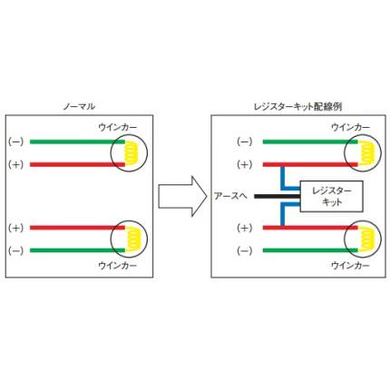 エアロフラッシュは消費電力が15Wと少ない為、ノーマルウインカーが21W23Wの車両に前後とも使用すると、点滅スピードが早くなる場合があります。その際、抵抗値を増やし、ノーマルのリレーを正常に動かす為に使用します。