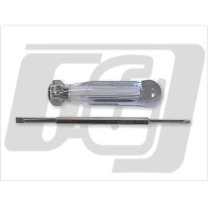 キャブレターのパイロットジェット(スロージェット)の締緩におすすめのキャブレタージェットドライバーです。今までの規格ドライバーでは、かみ合いが甘く、又、ジェットは真鍮で出来ている為ナメ易いという問題がありました。この商品は、通常のものより先端を少し厚くし、幅をジェット径にに合わせた事で、しっかりとかみ合い、ジェットも傷めずに脱着できます。ビットは1本で2種類のジェット(5mm/3.5mm)が柄の差し替え式でご利用出来ます。全長は 170mmです。パイロットジェット以外にもパイロットスクリュー・エアースクリューエアージェットなどにも最適です。