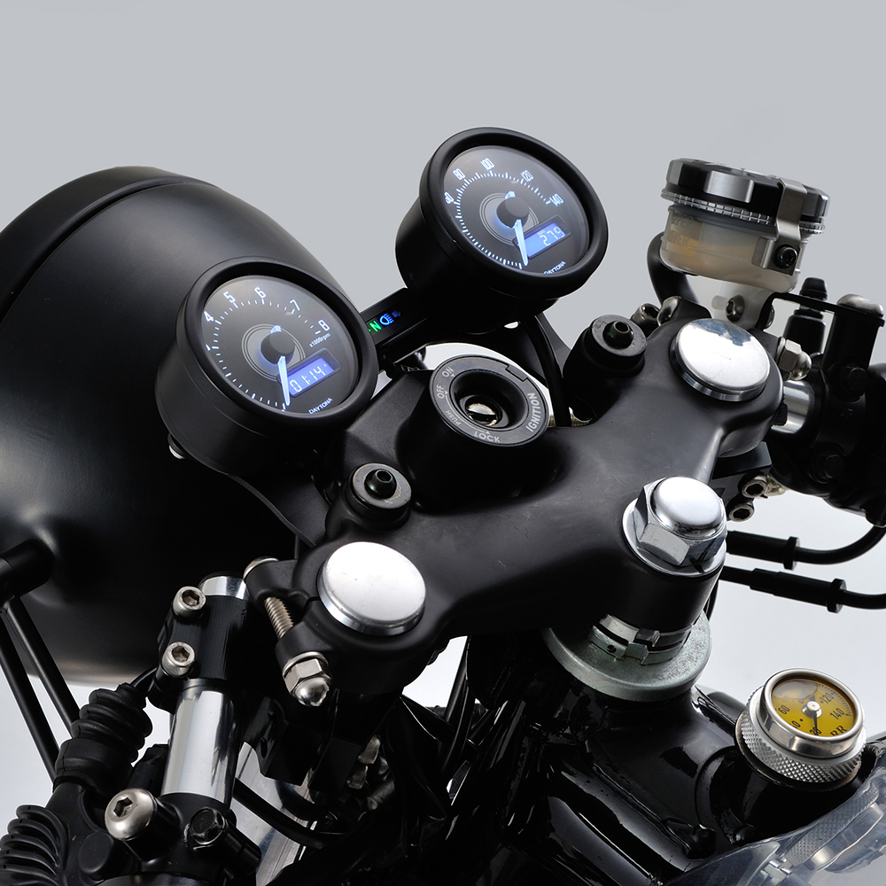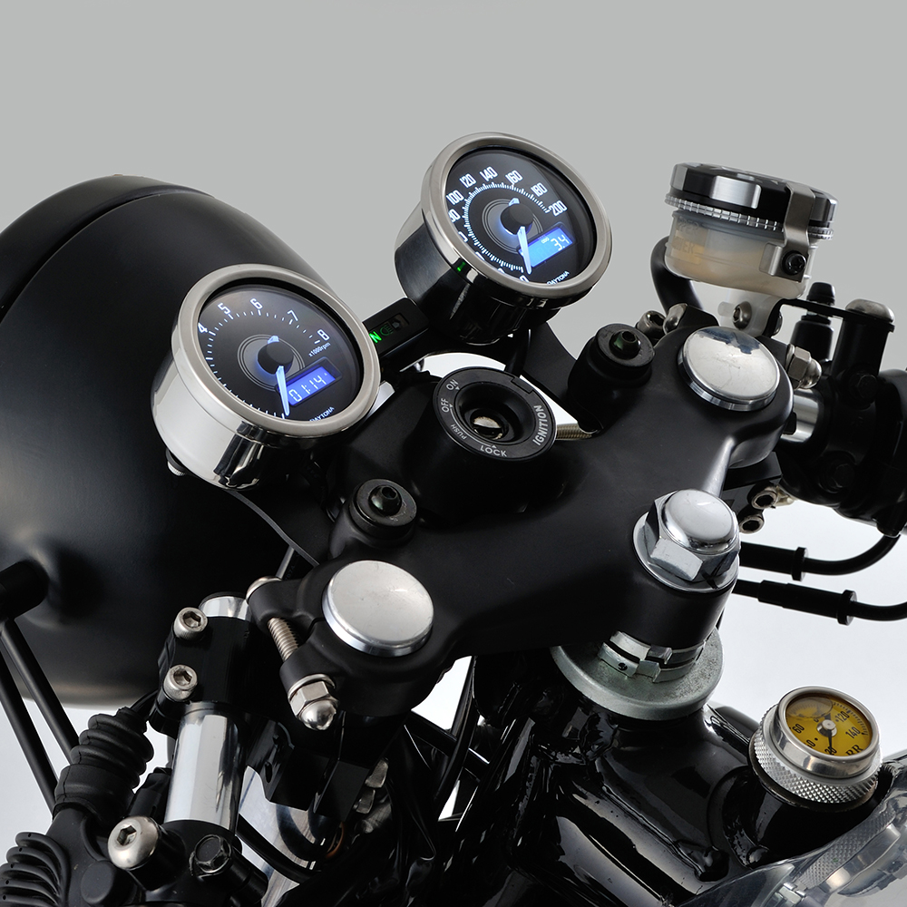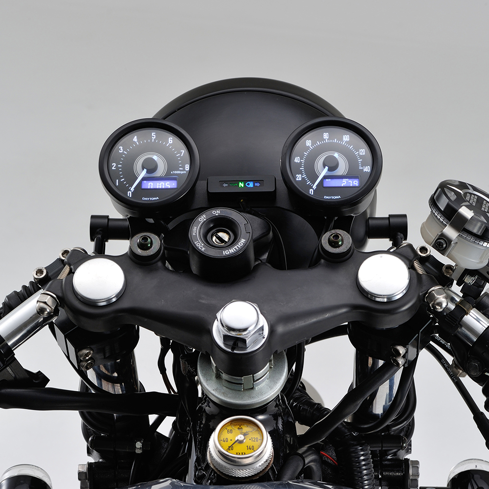 デイトナ製φ60の機械式、電気式、VELONAシリーズのメーターと車種別インジケーターKIT、マイクロインジケーター(ALPHA/BETA)が取付可能なダブルメーターステー。デイトナ製ビンテージトップブリッジで純正キーシリンダーをオフセット装着した場合にも対応します。電気式およびVELONAシリーズのメーターを使用する場合、トップブリッジ下側に取り付けできるため、より精悍なメーター周りを実現できます。デイトナ製φ60メーター専用スチール製マットブラック塗装※デイトナ製機械式メーターはトップブリッジ上側のみ装着可能。下側ではタコ/スピードメーターケーブルが純正ヘッドライトに接触するため、取り付けできません。(ヘッドライト、およびライトステーによっては取付可能です。)