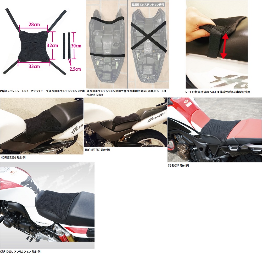シートとおしりの間に空間を確保し、通気による放熱効果で快適。適度なクッション性で長時間のライディングも快適。真夏の日差しによるシートの高温化を緩和します。雨天時、シートとおしりの間に空間を保ち、雨水によるレインパンツの水漏れ感を軽減。3Dメッシュ三枚重ねでオシリに優しい。※雨に濡れたあとはシートが保水しているので十分乾かすか、外して使うなどをして下さい。付属品:マジックテープ延長用エクステンション(30cm×2.5cm巾) 2本【素材】表地/バリアクロス600D PU加工サイズ:28×32×33cm (STANDARD)