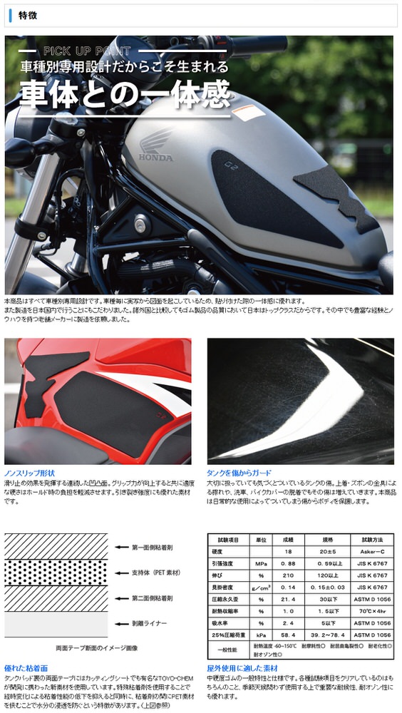 カラー:ブラック素材:中硬度EPDM系ゴム厚さ:3mm表面形状:ノンスリップ(スクエアブロック)付属品:マニュアル作業時間:0.2h設計から製造までを一貫して日本国内で行う「G2プロテクションタンクパッド」。商品名のG2とは、本商品の役割である「GRIP(タンクをとらえる)」と「GUARD(傷から守る)」からつけられました。車種ごとに一から型を作製した専用設計商品のため、車体との一体感にも優れます。【素材】表面にスクエア形の連続するシボ(凹凸)がついた、中硬度のゴム素材を使用しています。耐候性・耐熱性・非吸水性に優れるため、季節や天候に関わらずバイクを使用される方にもお勧めです。しっかりとしたグリップ力を持ちながら、ジャケット・パンツなどのウェア類には攻撃性のない素材になっています。【製造】製造は創業から71年、各種ゴム製品や高性能接着剤の開発も行う老舗メーカーに依頼しています。製造対象はレインウェアなどの一般消費者向け商品から小型精密機械、大型重機までと幅広く、豊富な経験と優れた技術を併せ持ちます。ISO9001認証(品質マネジメントシステム)も取得済みの国内メーカーです。【効果】優れた反発弾性と表面のノンスリップ形状により、安定したホールド感が得られます。また気づかないうちに増えていく小傷の防止にも役立ちます。【特徴】本商品はすべて車種別専用設計です。車種毎に実写から図面を起こしているため、貼り付けた際の一体感に優れます。また製造を日本国内で行うことにもこだわりました。諸外国と比較してもゴム製品の品質において日本はトップクラスだからです。その中でも豊富な経験とノウハウを持つ老舗メーカーに製造を依頼しました。【ノンスリップ形状】滑り止め効果を発揮する連続した凹凸面。グリップ力が向上すると共に適度な硬さはホールド時の負担を軽減させます。引き裂き強度にも優れた素材です。【タンクを傷からガード】大切に扱っていても気づくとついているタンクの傷。上着・ズボンの金具による擦れや、洗車、バイクカバーの脱着でもその傷は増えていきます。本商品は日常的な使用によってついてしまう傷からボディを保護します。【優れた粘着面】タンクパッド裏の両面テープにはカッティングシートでも有名なTOYO-CHEMが開発に携わった新素材を使用しています。特殊粘着剤を使用することで経時変化による粘着性能の低下を抑えると同時に、粘着剤の間にPET素材を挟むことで水分の浸透を防ぐという特徴があります。【屋外使用に適した素材】中硬度ゴムの一般特性と仕様です。各種試験項目をクリアしているのはもちろんのこと、季節天候問わず使用する上で重要な耐候性、耐オゾン性にも優れます。