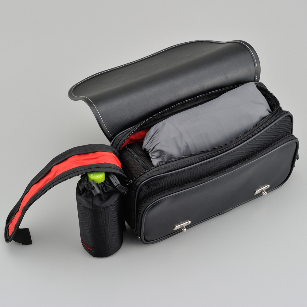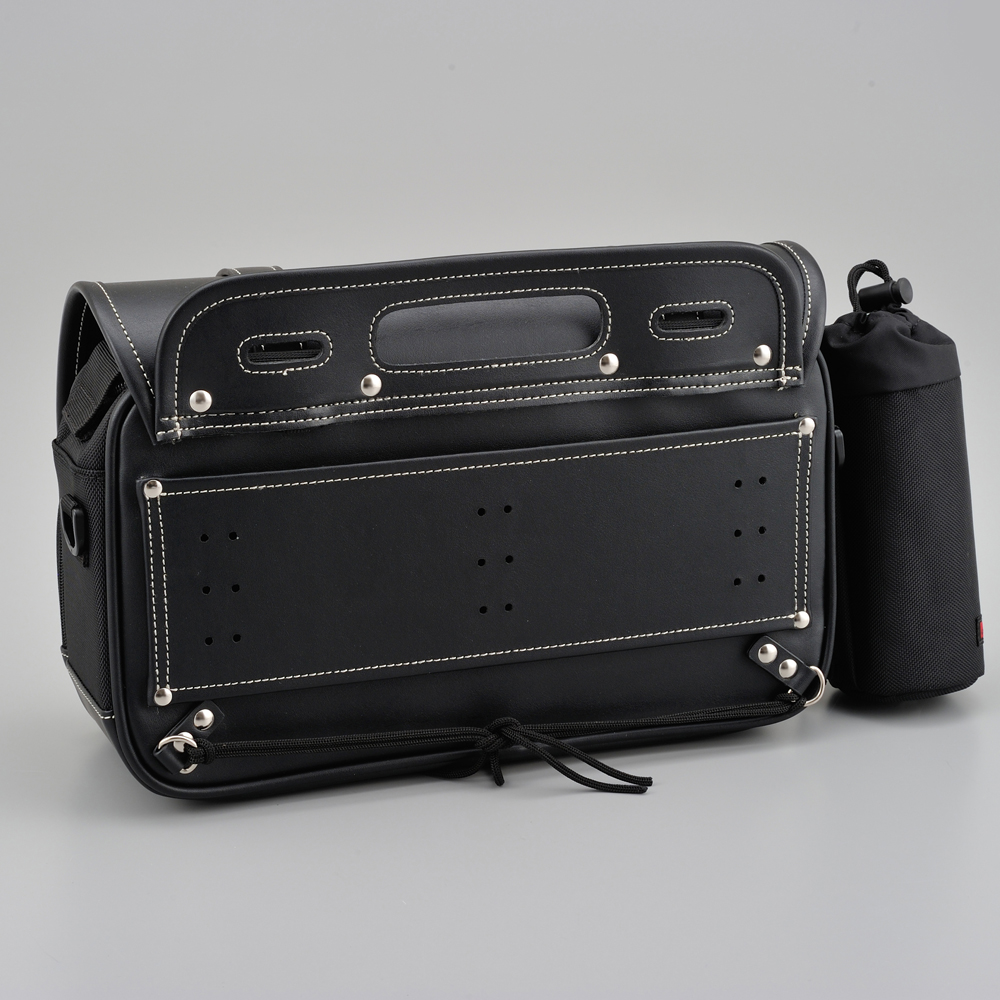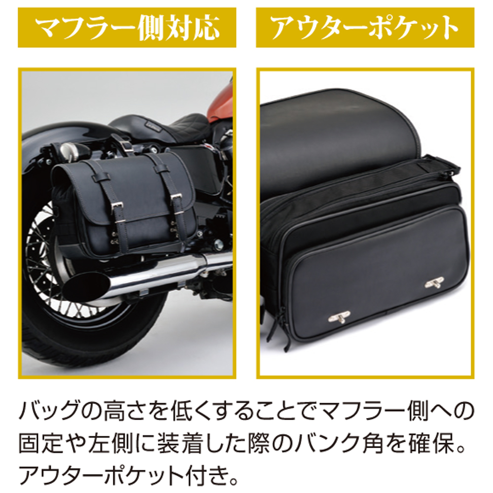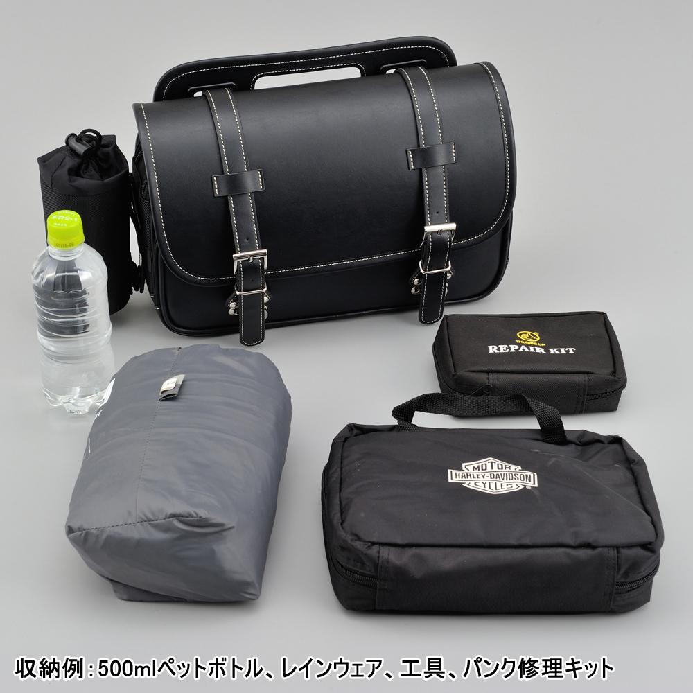 コンパクトな9リットルサドルバッグ。バッグの高さを低くすることでマフラー側への固定や、左側に装着した際のバンク角を確保。アウターポケット付き。商品構成:バッグ本体、レインカバー、ボトルホルダー、ひも×2、合皮固定ベルト×2、ナイロン固定ベルト×2、アジャスター25mm用×2サイズ:縦200×横360×厚み130(mm)バッグ素材:合成皮革×1680Dナイロン※バッグの装着にはサドルバックサポートとの同時装着が必要。※最大積載重量:5kg