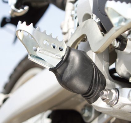 泥の詰まり易いフットペグの可動部に予めセットし、泥詰まりを防止するラバー製カバー。伸縮性があるので汎用性に優れます。