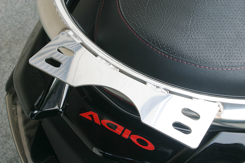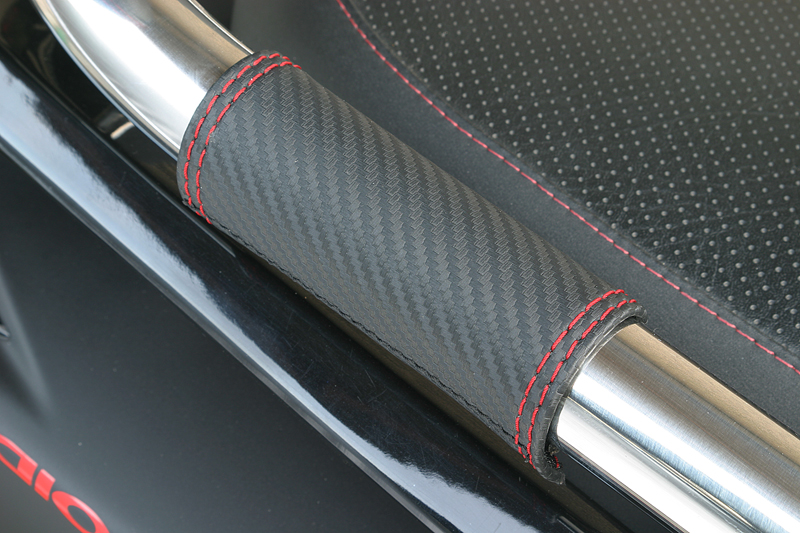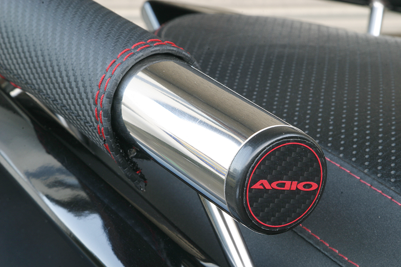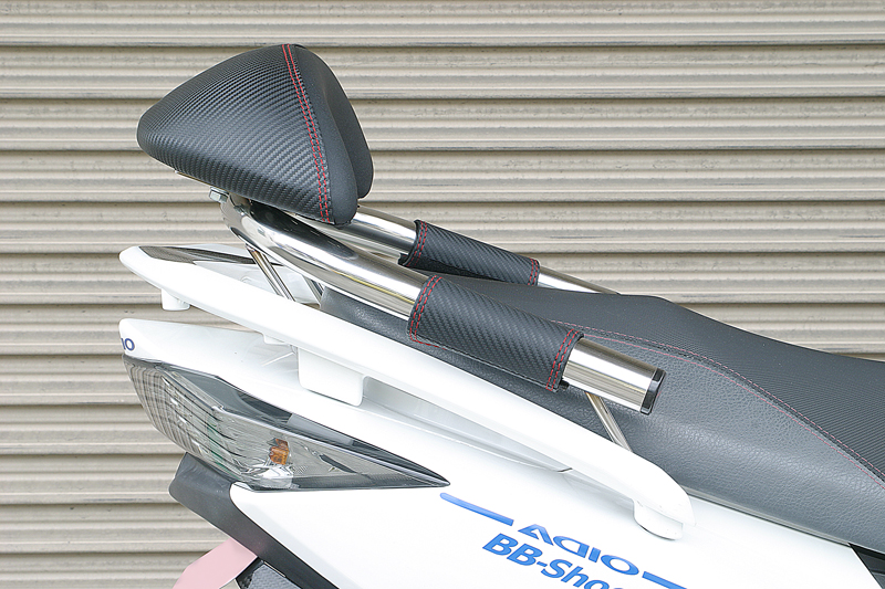 タンデム時に便利なバックレストとタンデムバー。実用性だけではなく、ファション性も重視した見せるタンデムバーの発売です。バーの部分は、存在感がありながら握りやすいφ34のステンレス製。そしてバックレスト、グリップカバー、バーエンドにはスポーティーなカーボンブラック&レッドを配しました。グリップカバーは、パイプの冷たさが伝わりにくく、後席の方にも優しい心遣い。実用性とファッション性を兼ね備えたタンデムバーです。バックレストは前後2段階調整。エンドキャップには本物カーボンにADIOのロゴがレーシー備考: バックレスト付き