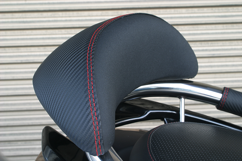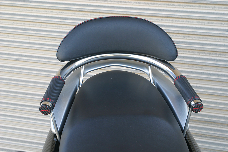 タンデム時に便利なバックレストとタンデムバー。実用性だけではなく、ファション性も重視した見せるタンデムバーの発売です。バーの部分は、存在感がありながら握りやすいφ34のステンレス製。そしてバックレスト、グリップカバー、バーエンドにはスポーティーなカーボンブラック&レッドを配しました。グリップカバーは、パイプの冷たさが伝わりにくく、後席の方にも優しい心遣い。実用性とファッション性を兼ね備えたタンデムバーです。バックレストは前後2段階調整。エンドキャップには本物カーボンにADIOのロゴがレーシー備考: バックレスト付き
