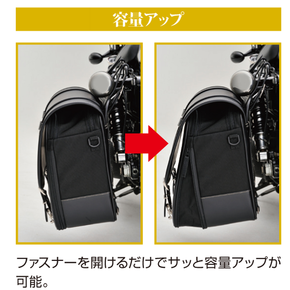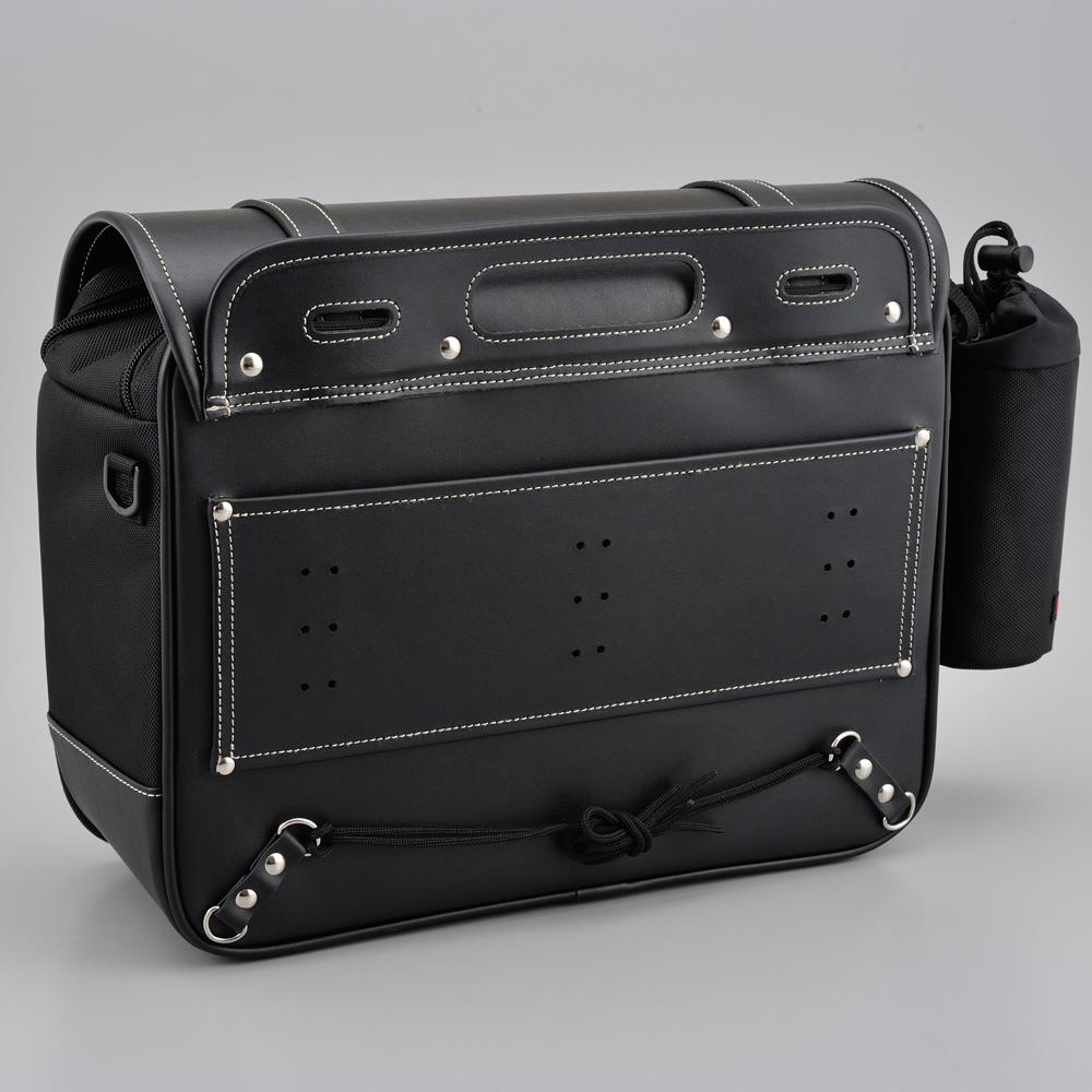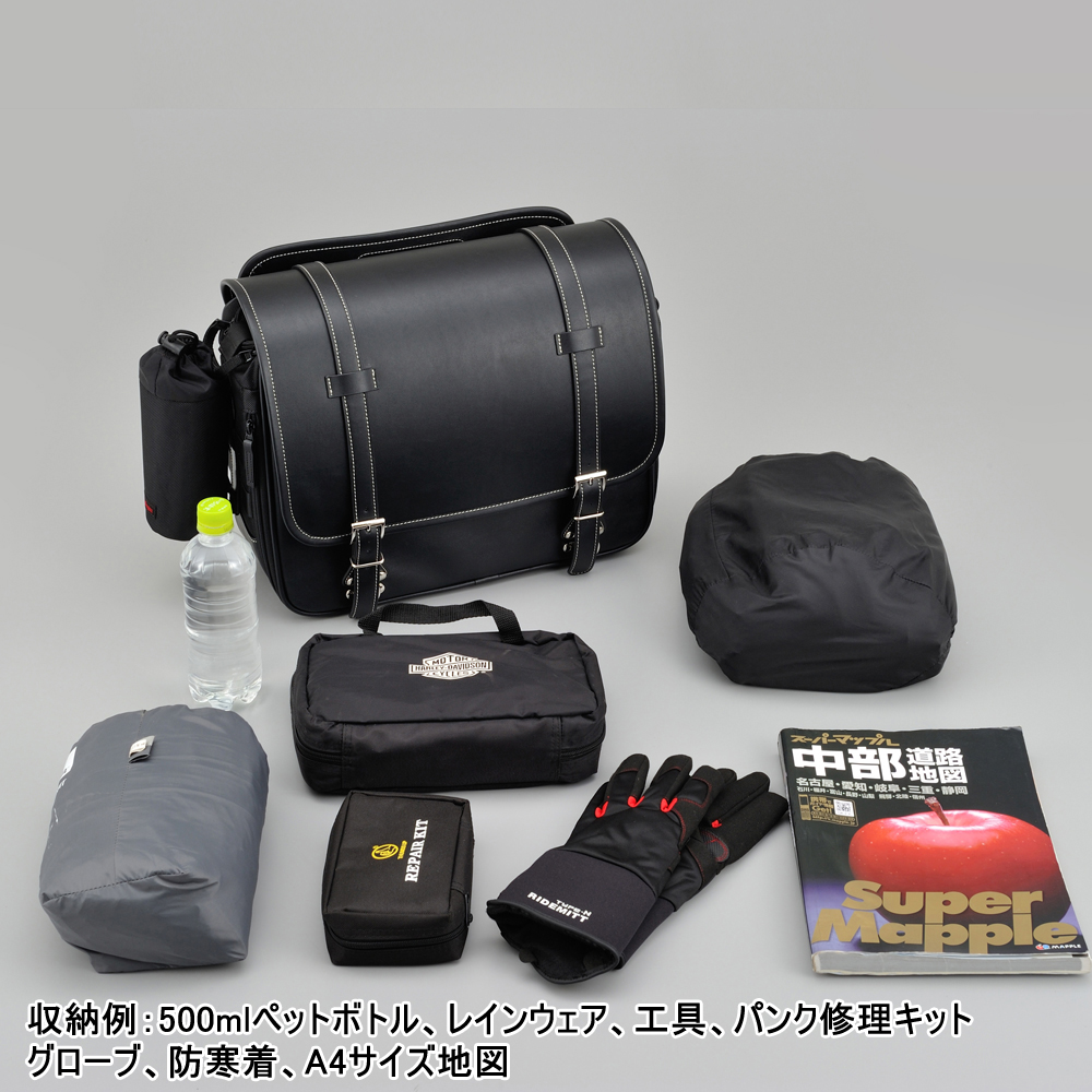 日帰りツーリングに最適な18リットルのサドルバッグ。長方形のスタンダードなシルエットは飽きることなく末永くご愛用いただけます。バック背面に別売のサドルバッグサポートを差し込むためのベルトを採用。走行時にバッグが振れて傷つくことから防止します。商品構成:バッグ本体、ボトルホルダー、レインカバー、ひも×2、合皮固定ベルト×2、ナイロン固定ベルト×2、アジャスター25mm用×2サイズ:縦300×横400×厚み150(mm)バッグ素材:合成皮革×1680Dナイロン※バッグの装着にはサドルバックサポートとの同時装着が必要。※最大積載重量:5kg