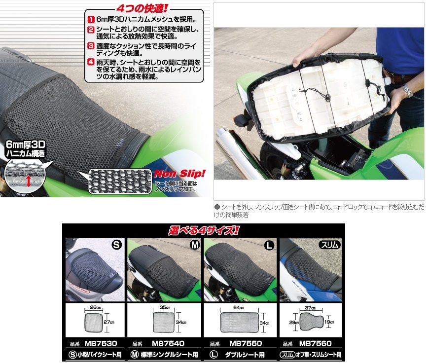 シートと身体の間に隙間を作り蒸れずに快適クッション性があるので長時間の運転がラクチン3Dハニカムメッシュシートカバーがアナタの悩みを解決〜4つの快適〜 シートとおしりの間に空間を確保し、通気による放熱効果で快適。 適度なクッション性で長時間のライディングも快適。真夏の日差しによるシートの焼けを緩和します。 雨天時、シートとおしりの間に空間を保ち、雨水によるレインパンツの水漏れ感を軽減。 幅:34cm 長さ:64cm