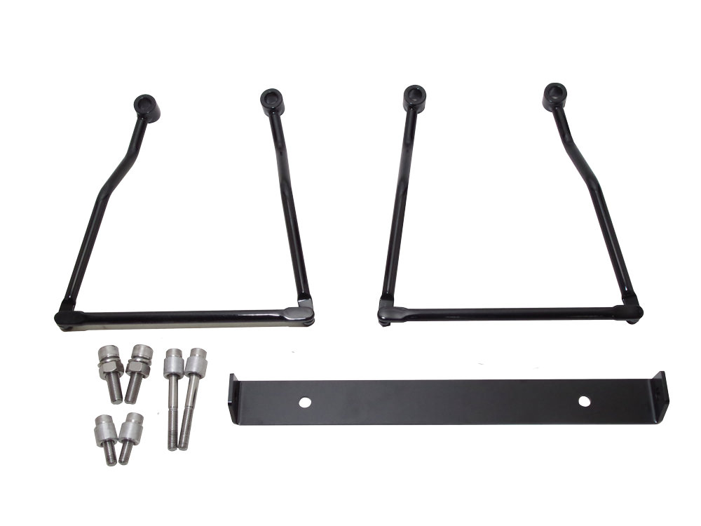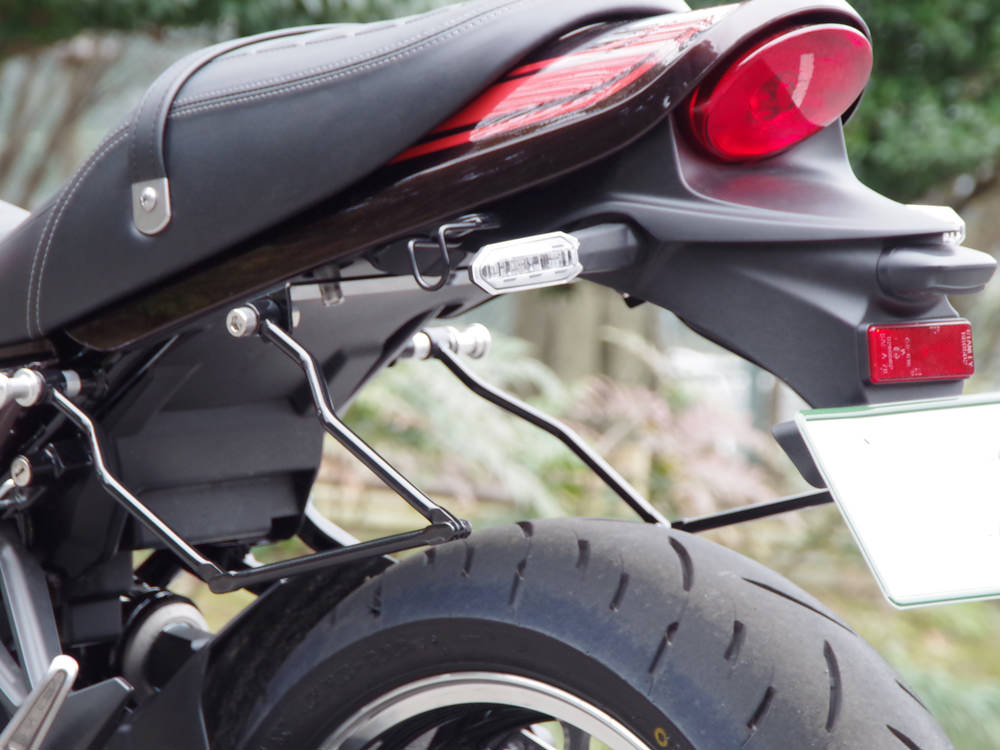 サドルバッグ装着用ステーとブラックのサドルバッグサポート二本のセットです。サポートは左右両用です。こちらの商品は左右セットです。Z900RSに装着した際に違和感のないデザインを追い求めました。バッグサポート本体には可動式のタイプを選択。角度が調整できるので好みの見た目にすることが可能です。サドルバッグサポートの固定は二点で行いますが、一点は荷掛けフック部分に固定します。もう一点はリアシート下側にボルトで固定しますが上向き、下向きどちらでも装着できるように致しました。ちょっとした違いですが見た目が異なりますのでお好みで装着してください。サドルバッグサポート時にしっかりとタイヤへの巻き込みを防ぎバッグが傷つくのを防ぎます。