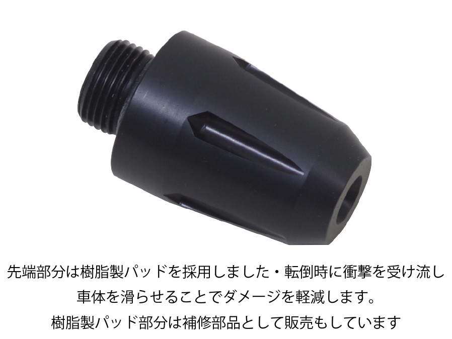 本体:アルミ 先端:ジュラコン(R)2本セットニンジャ650のカウル部分からしっかりと交換可能なジュラコン(R)(樹脂)部分が外に張り出すので立ちゴケや転倒時などにカウルへのダメージを軽減します。ジュラコン(R)部分は脱着簡単なので転倒等で傷がついてしまった場合にも交換の手間がかかりません。もちろんハンドルやミラーに比べたら幅が狭いので走行中に気を使うことも殆どありません。ニンジャ650のバリエーションモデルであるカウル無しのZ650にも装着可能です。※ジュラコン(R)は、ポリプラスチックス株式会社が日本その他の国で保有する登録商標です。